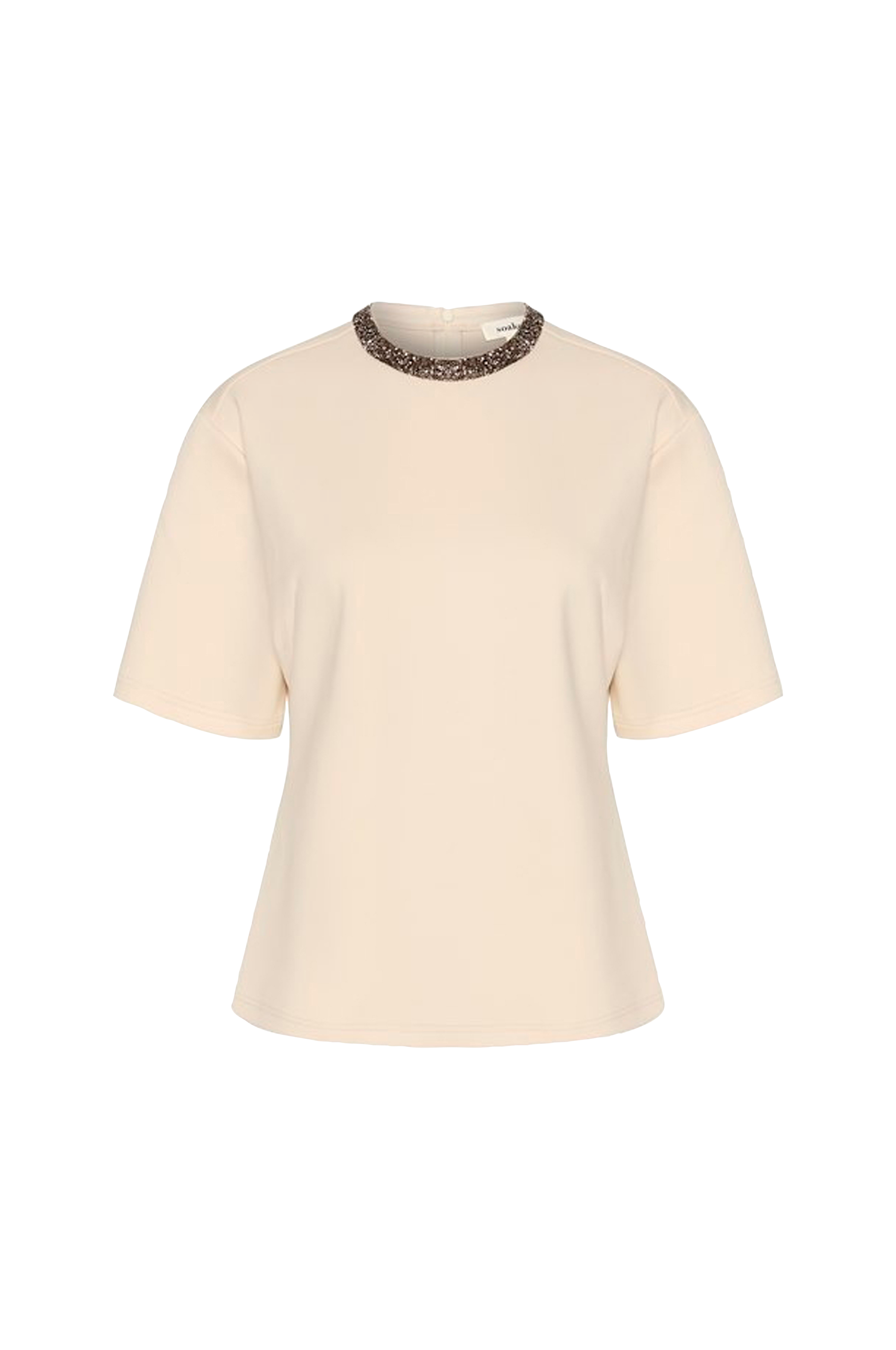 • Let figurformet model i jersey• Kort, lige ærme• Halsudskæring med broderede rhinstene og lynlås i nakken