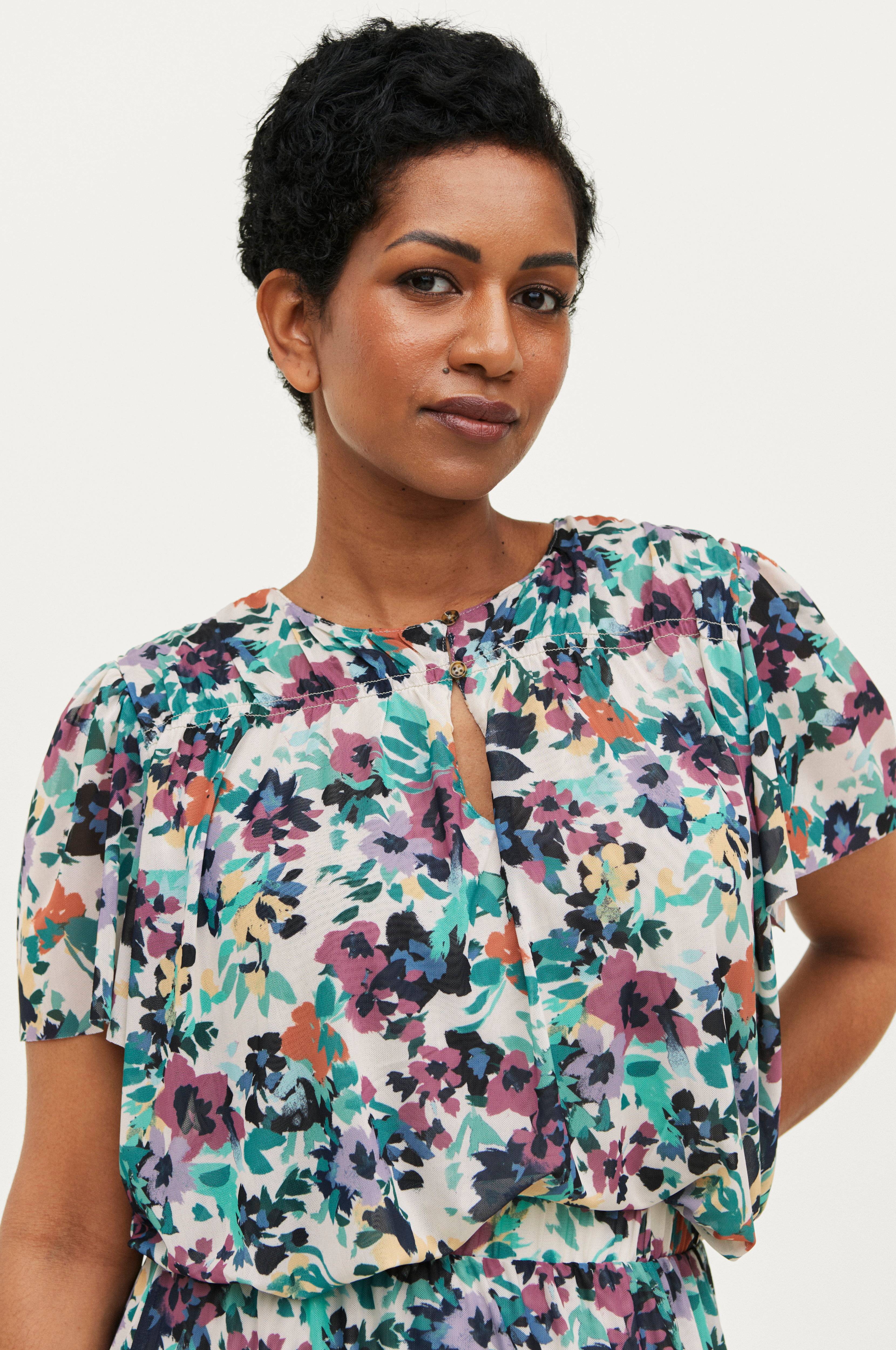 • Kort ærme med rynket skuldersøm • Ventilation med knapper foran • Dekorativ smock oppe foran • Elastisk mesh med for • Produktet indeholder genindvundet materiale, som genbruges for at reducere mængden af affald samtidigt med at der ikke anvendes nye ressourcer.
