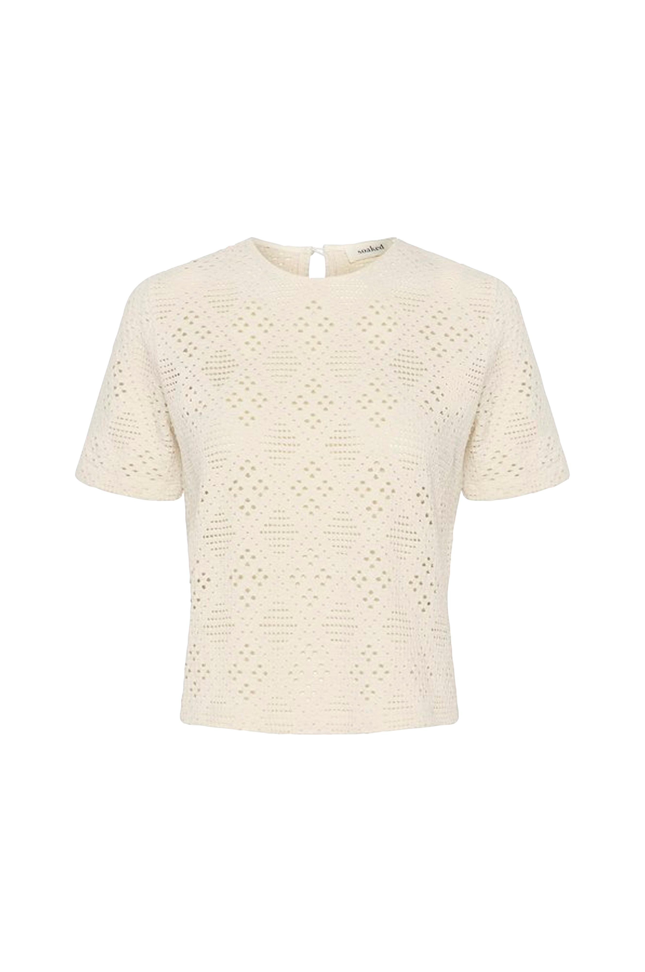 • Kortærmet top med hulmønster• Rund halsudskæring• Ventilation med knap i nakken