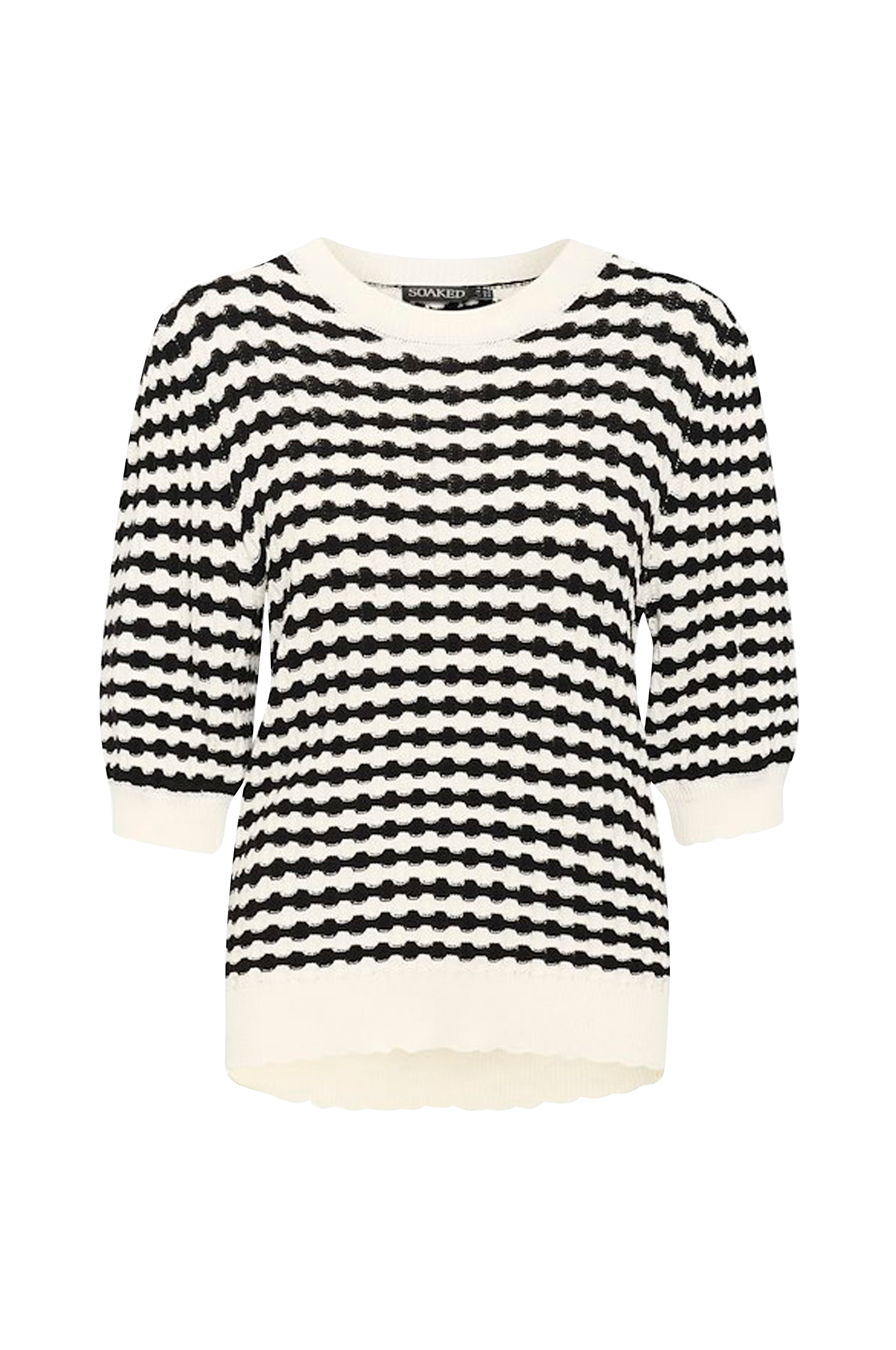 • Strukturstrikket trøje i viskoseblanding• Korte ærmer• Bølget kant ved manchetterne, nederst og i halsen