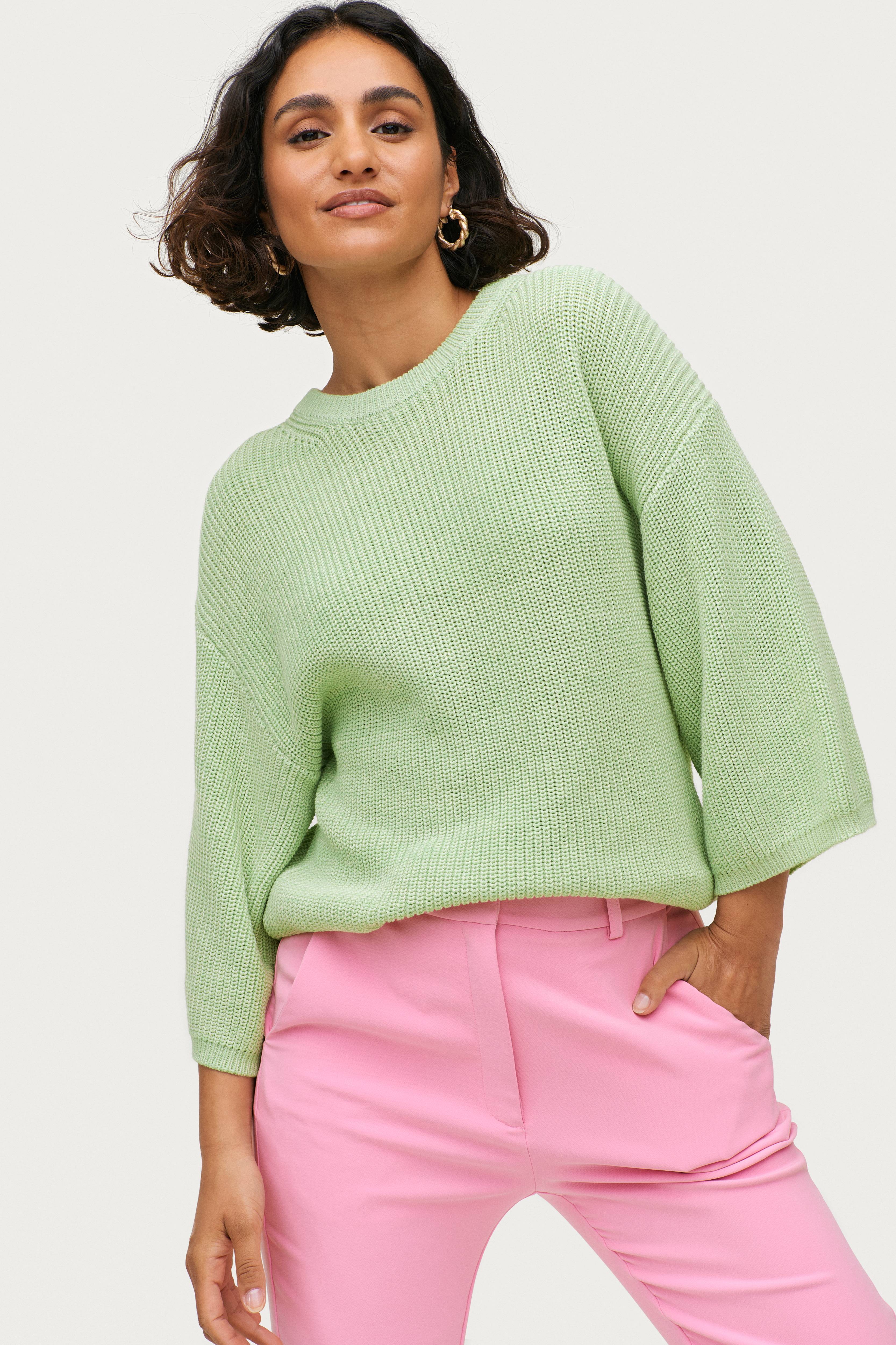 • Bred, ribbet model• Rund halsudskæring• Nedsænket skulder• Bredt, 3/4 langt ærme