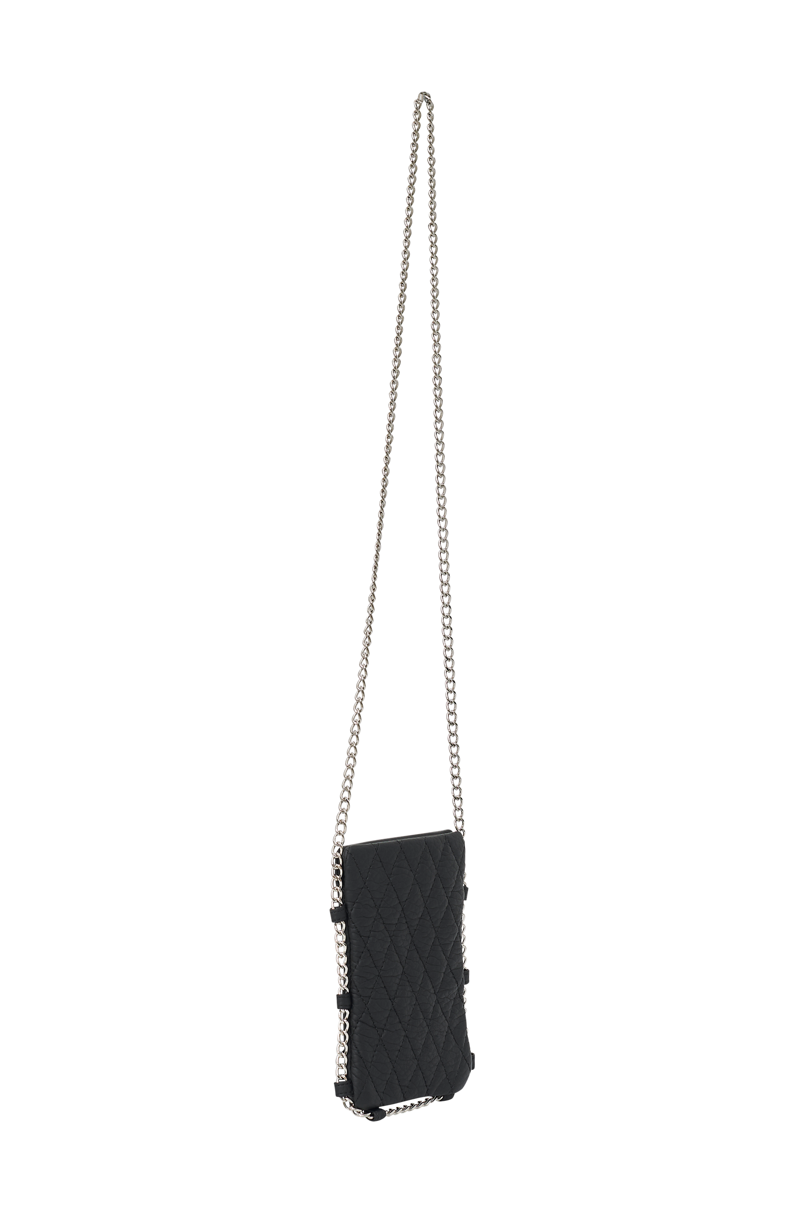 Lille model i quiltet, imiteret skind med lang, sølvfarvet kæde i stropper rundt om. Åbning foroven.Mål ca. B11 x H18 cm.