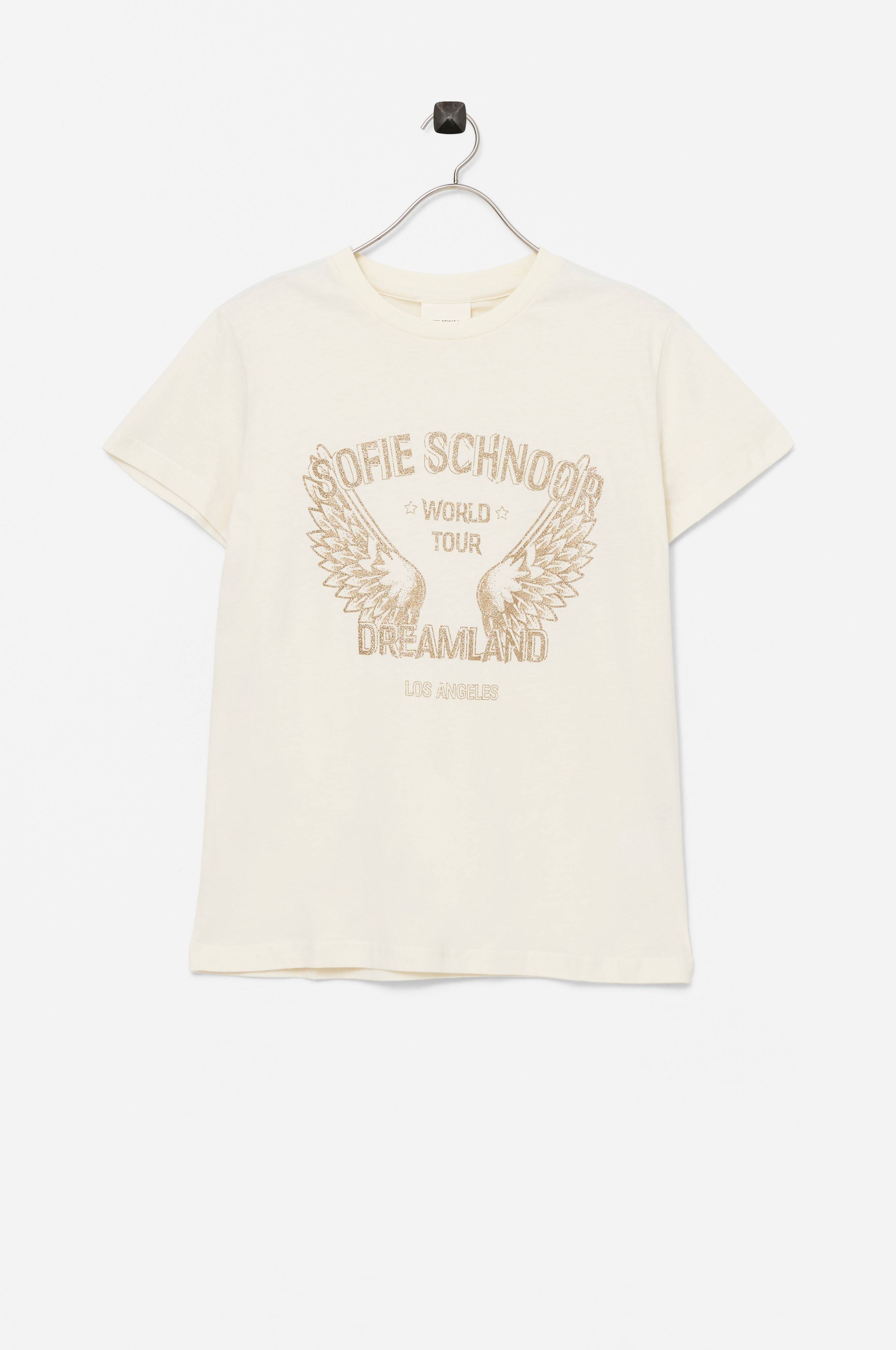 • Rund, ribbet halsudskæring• Guldglitrende tryk foran