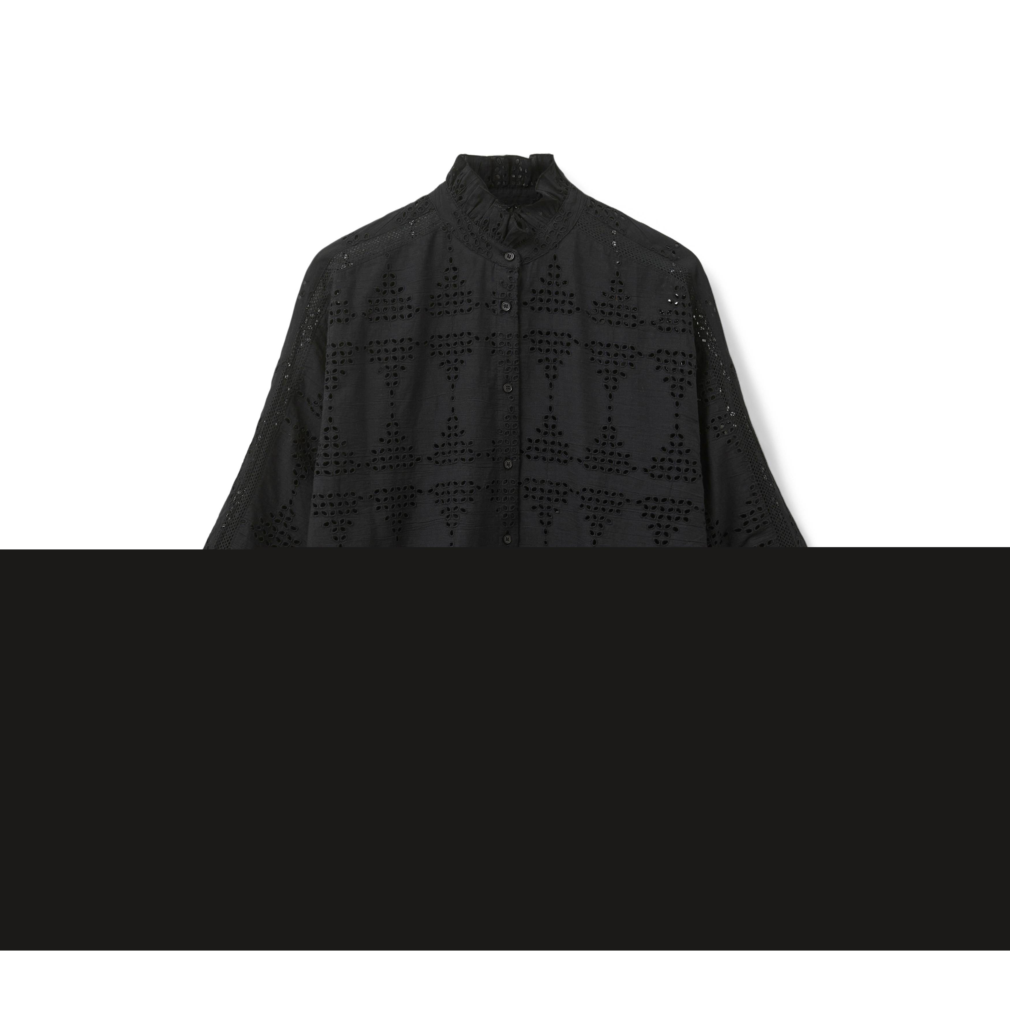 • Bluse med hulbroderier hele vejen rundt• Rund halsudskæring med flæsekrave• Skjult knaplukning foran• Lange ærmer med elastik og volant ved manchetterne