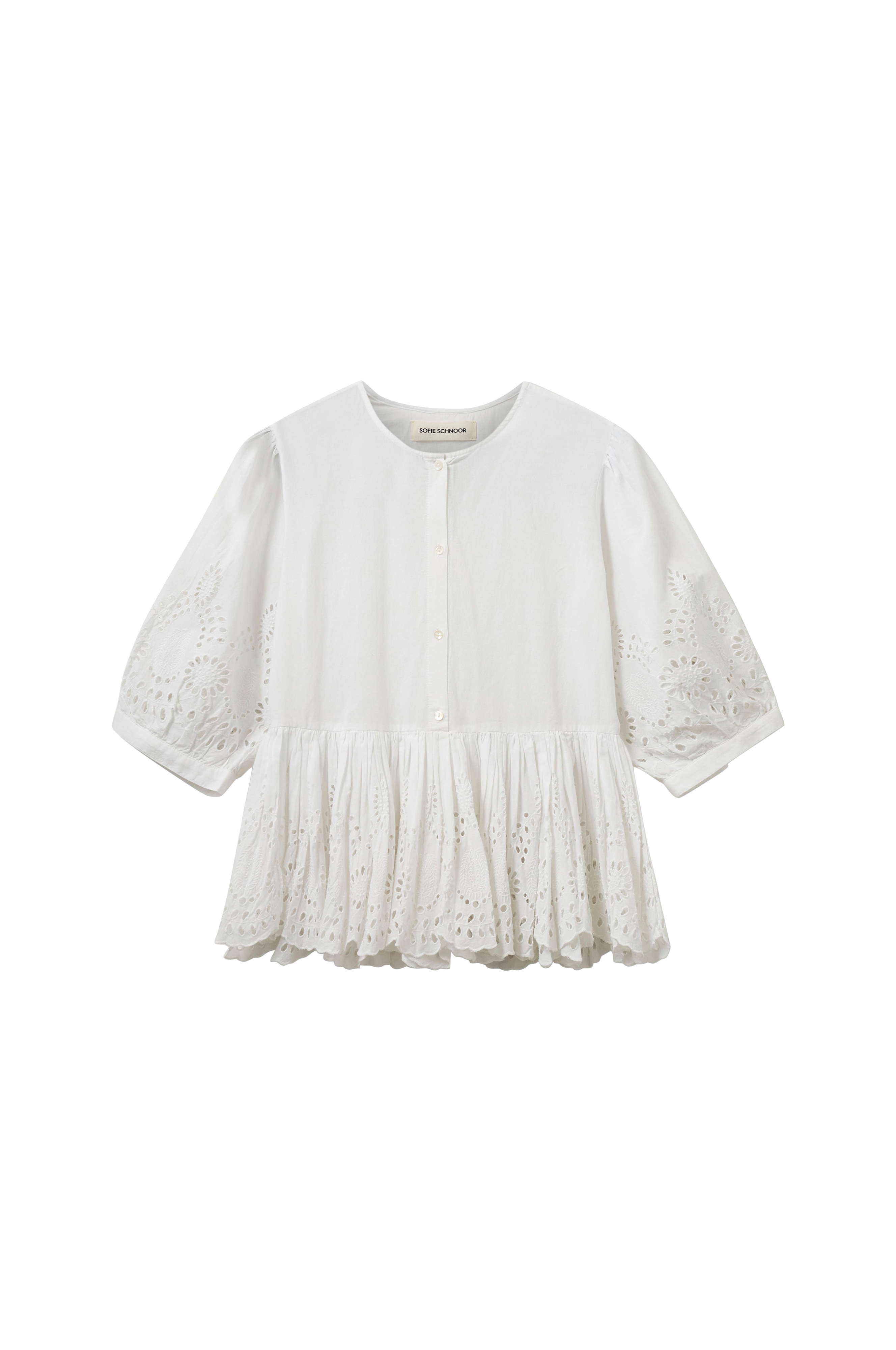 • Bredt peplumdesign med hulbroderier nederst• Rund hals• Lige, 3/4 langt ærme med slids og bindebånd på oversiden• Defineret, rynket talje med vidde nederst