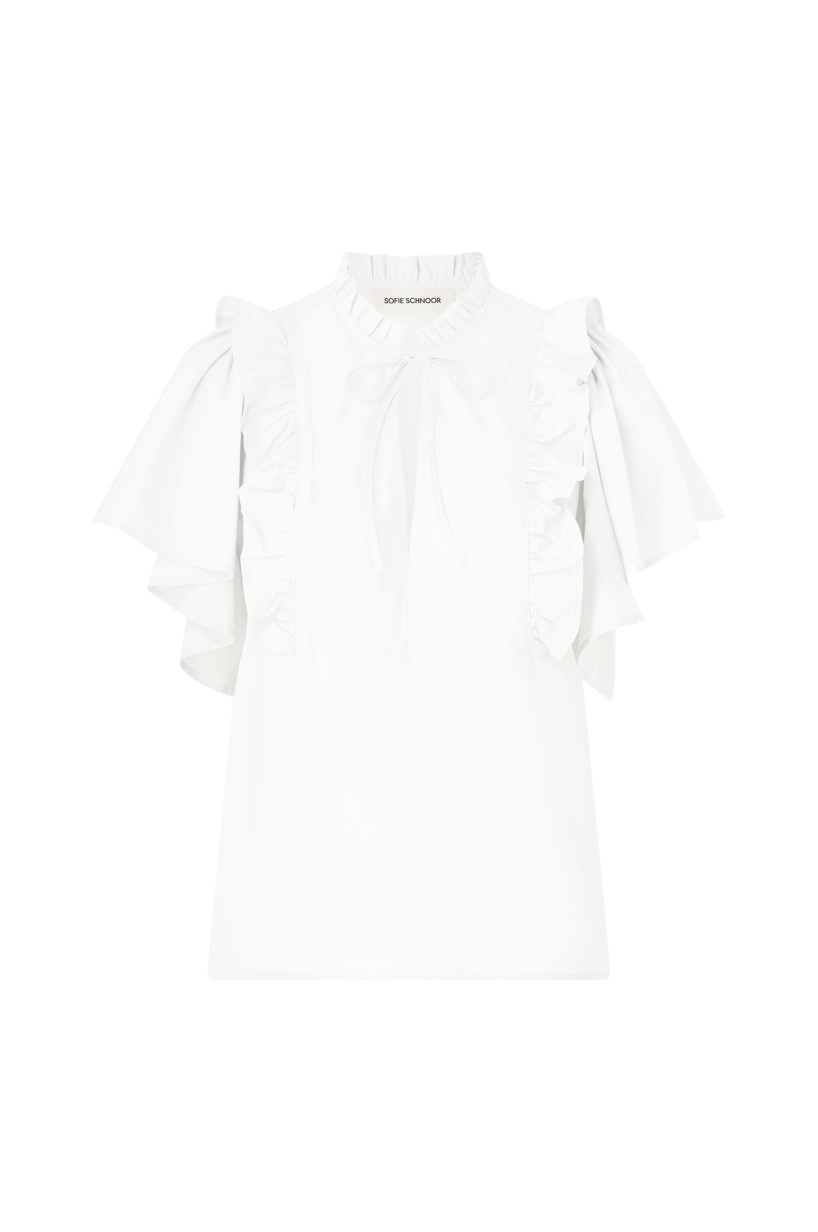 • Rund hals med flæsekant og bindebånd foran