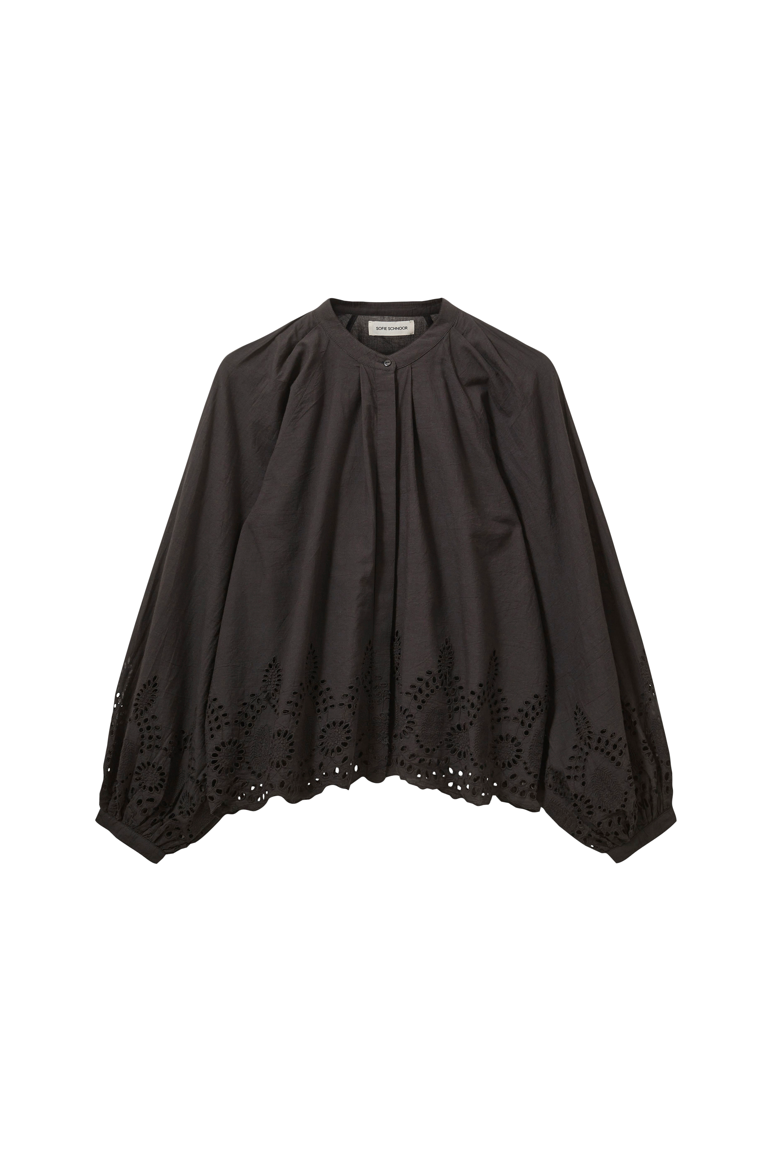 • Lige oversize model med hulbroderier nederst• Rund hals med foldede lægge foran• Skjulte knapper hele vejen frem• Ekstra bredt raglanærme med tynd manchet og hulbroderier nederst• Bølget søm