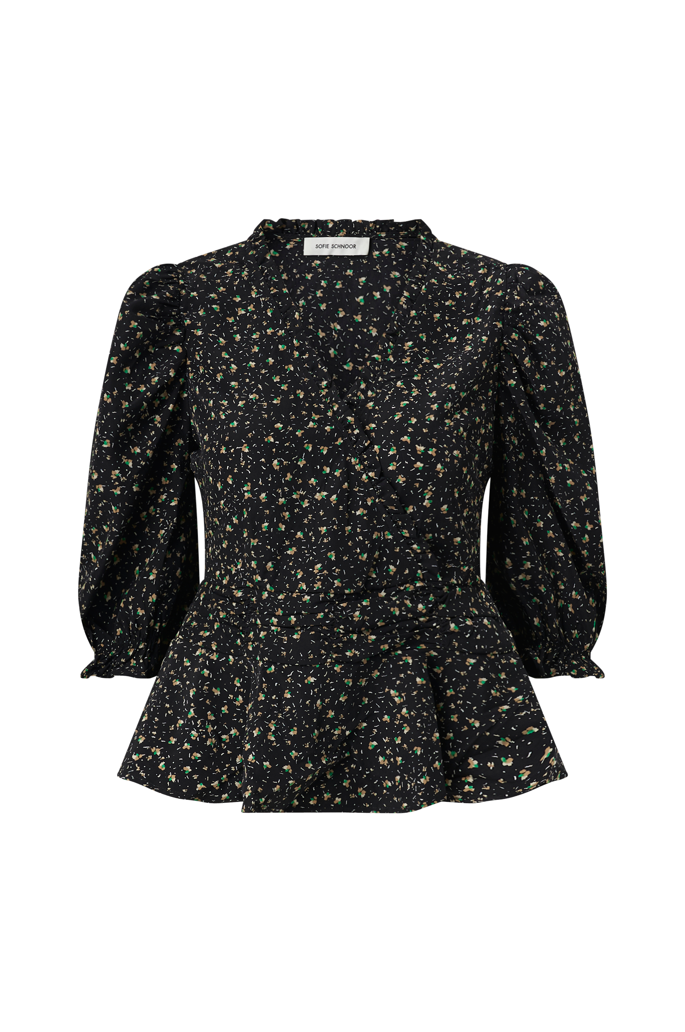 • V-udskæring med slå-om• 3/4 lange ballonærmer• Volant langs udskæringen• Defineret talje med samling• Skjult lynlås i siden