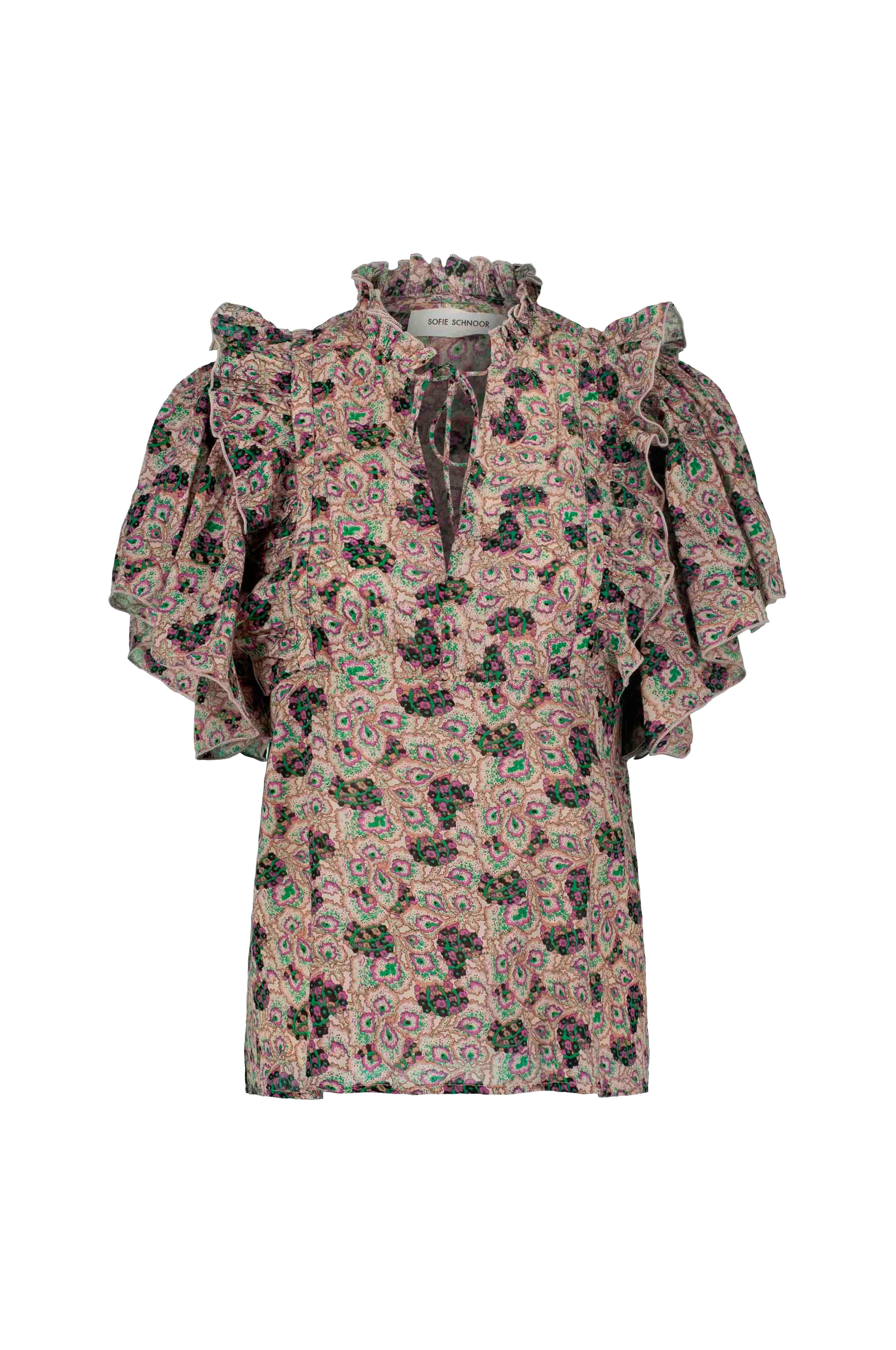 • Mønstret bluse med flagrende ærmer• Ventilation med bindebånd i halsen• Volant i halsen og over skuldrene