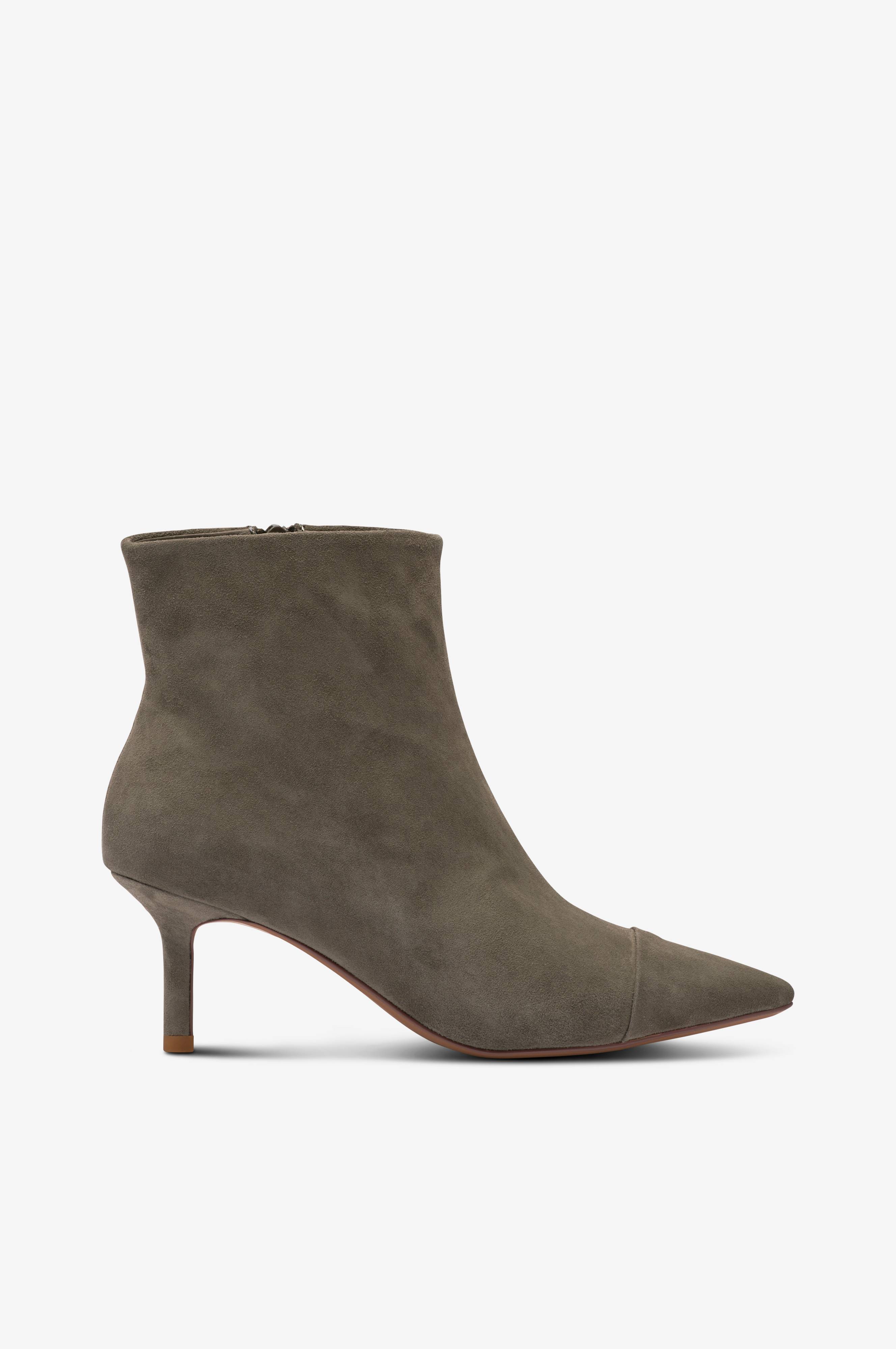 • Ankelboots i ruskind• Spids snude• Tynd, beklædt hæl• Lynlås på indersiden af skaftet• Hælhøjde: 6 cm