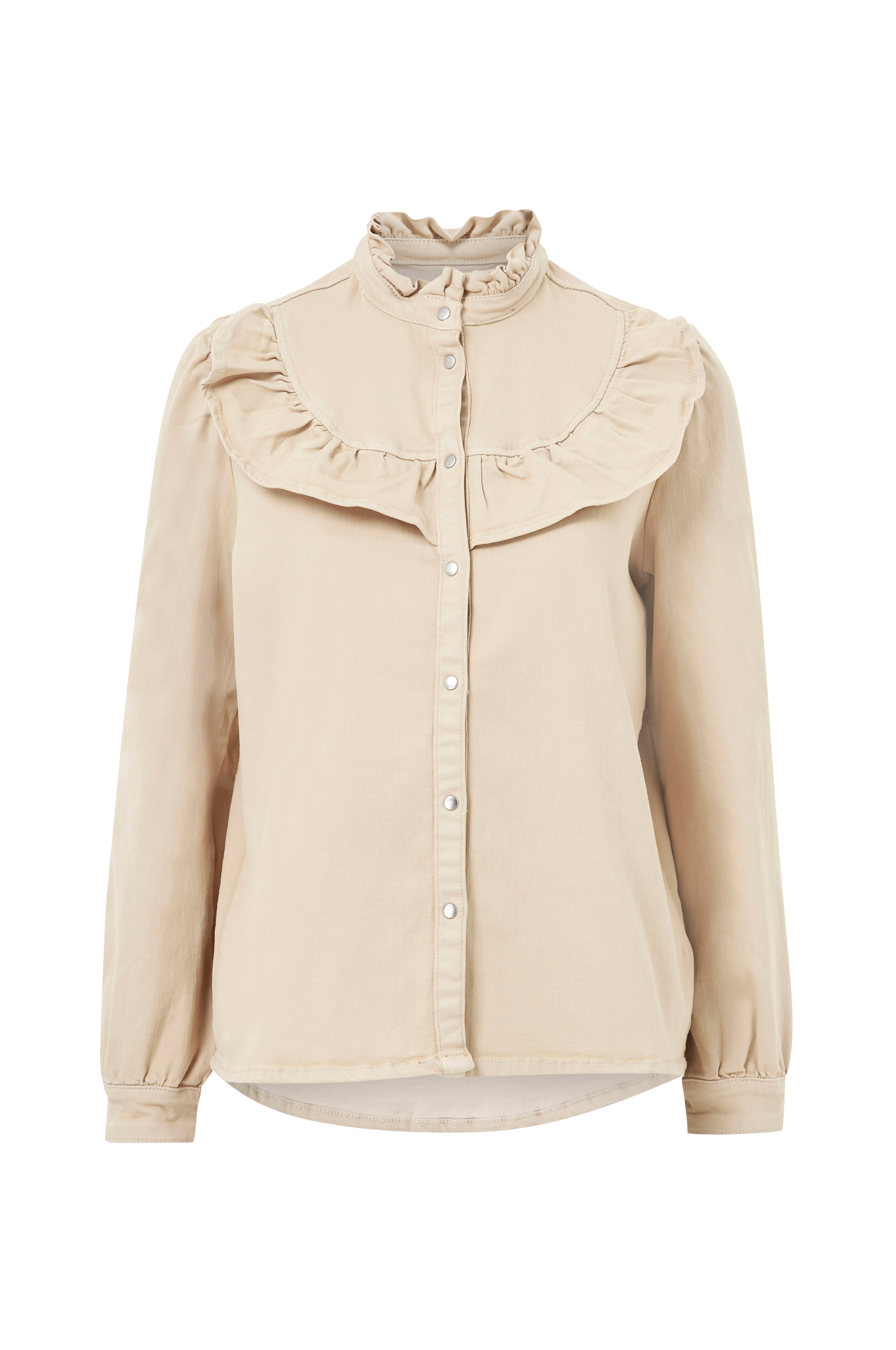 Lige model med løst snit som har rundskuret skulderbærestykke foran med påsyet flæse og v-format skulderbærestykke med lagt læg bagpå. Halvhøj krave med lille flæsekant øverst og lukning med trykknapper hele vejen foran. Vide ærmer med rynkning ved skulderen og manchet i ærmekanten.