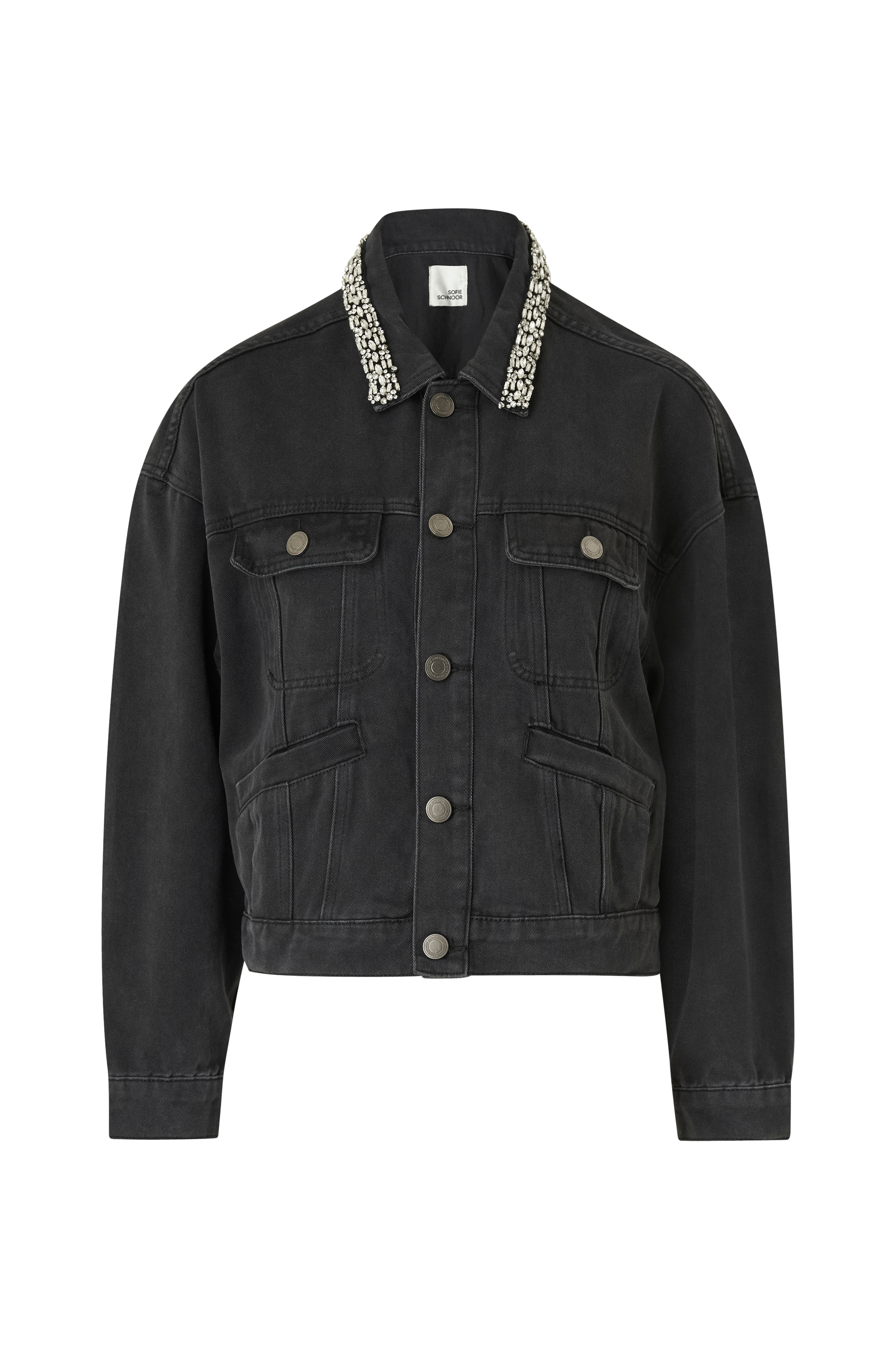 • Bred, lige model• Broderet rhinsten på kraven• Metalknapper• Brystlommer med låg• Indlagte lommer• Langt ærme med manchet• Længde: 55 cm i størrelse 36