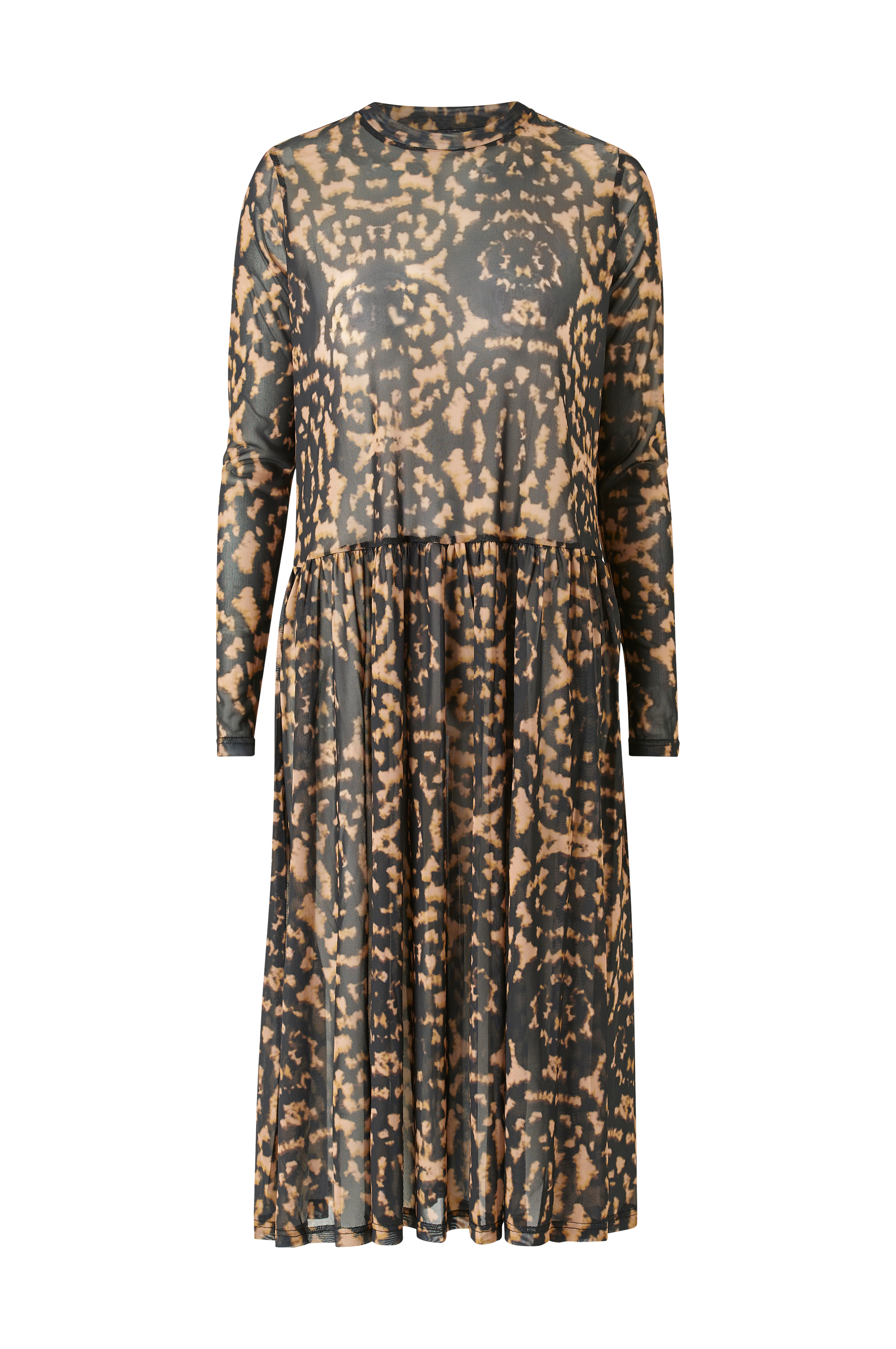 Kjole Lulu Dress fra Sofie Schnoor. A-formet model i stretchjersey med printet mønster foran. Langt ærme og rund hals med lille krave som har påsyet kant. Afskæring i taljen med vidde i nederdelen. Længde ca. 118 cm i str. S.