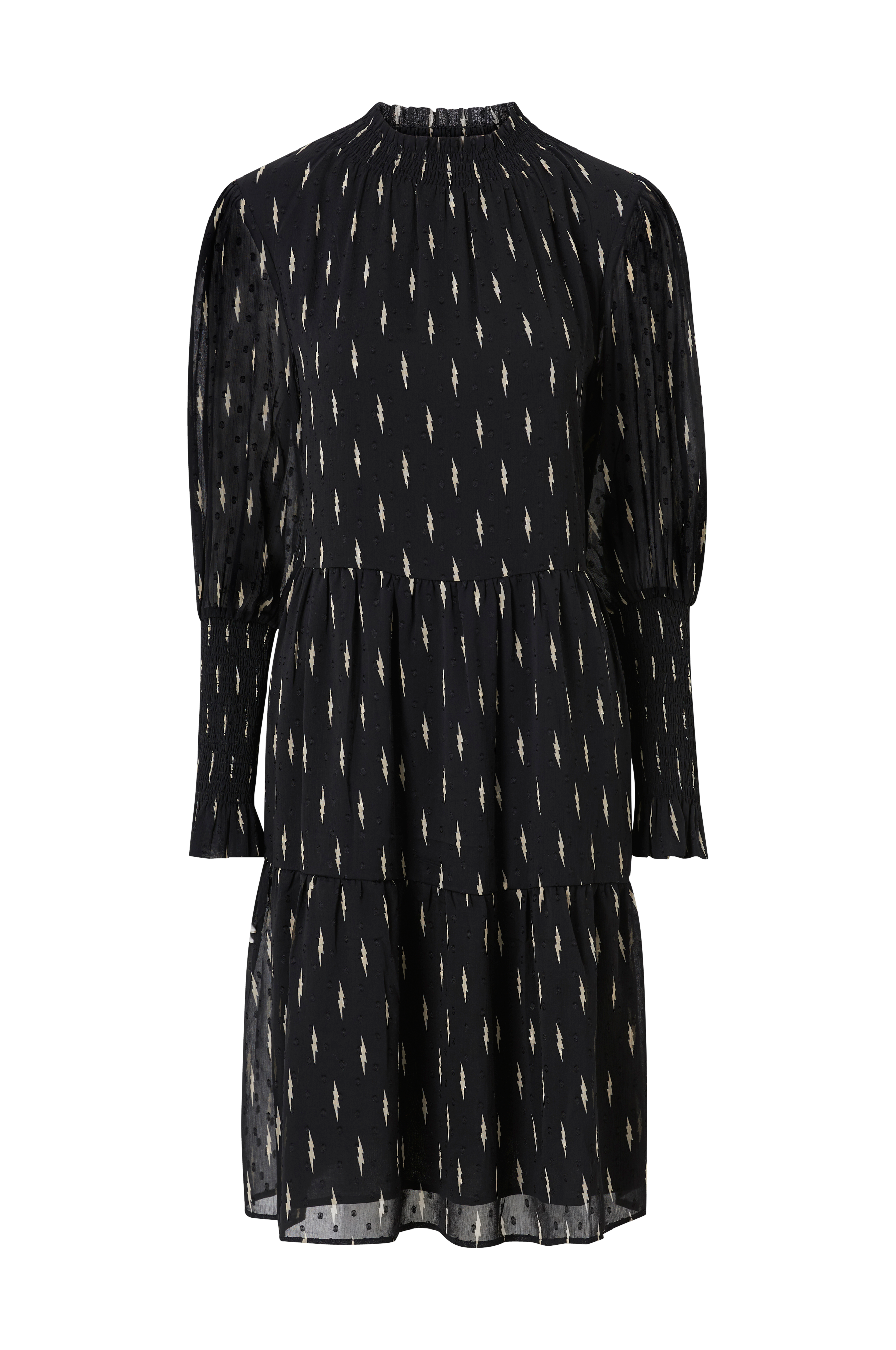 Kjole Mitzie Dress fra Sofie Schnoor. A-formet model med meget vidde i strukturvævet chiffon. Halvhøj krave i smockelastik og vidt ærme med bred smockelastik forneden. Afskæring med rynkning i hoftehøjde samt bred, påsyet flæse i kanten forneden. Vævet for. Længde ca. 108 cm i str. S.