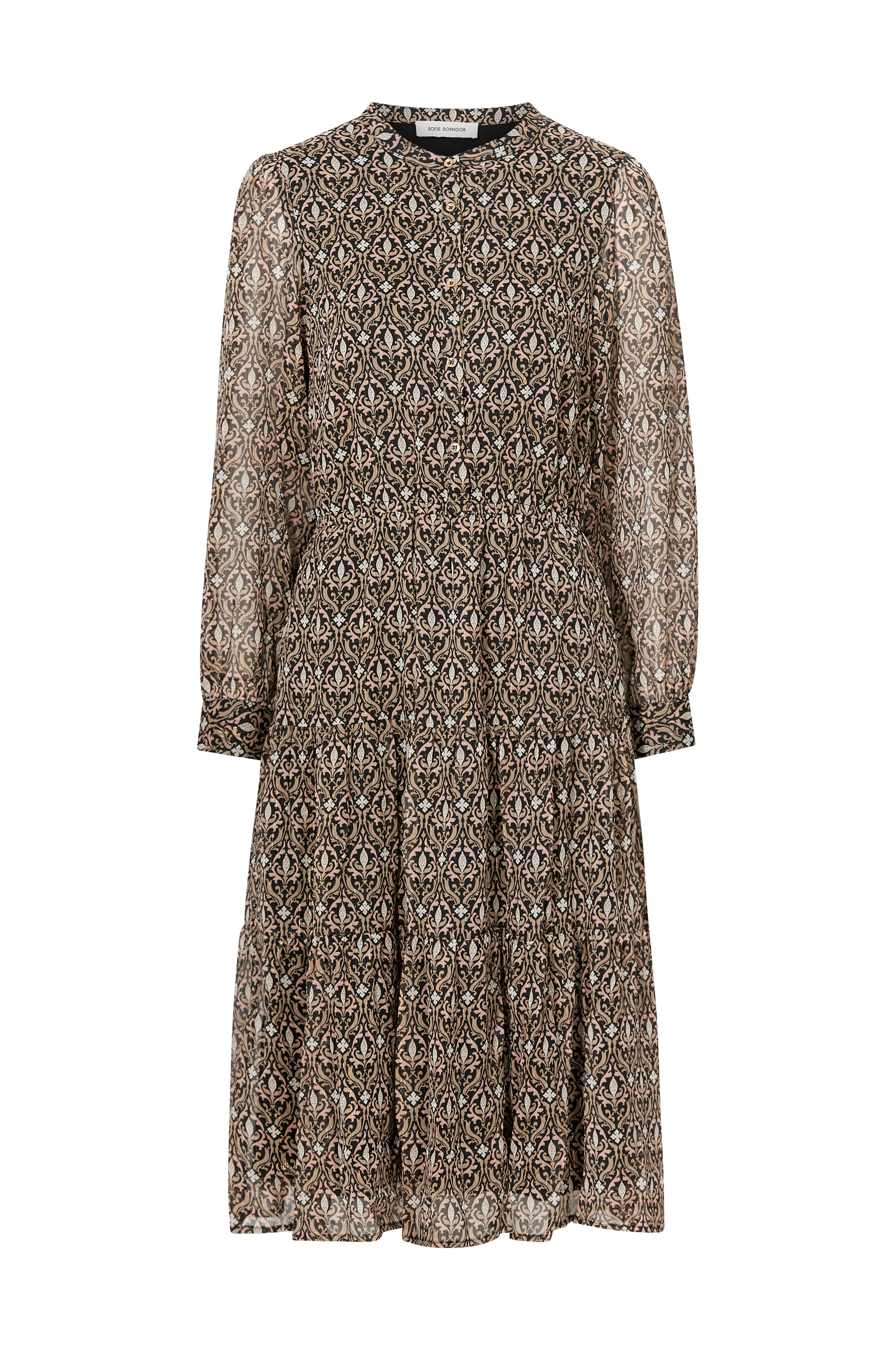 • Model med svaj i chiffon med guldfarvede striber• Rund halsudskæring• Kort knaplukning foran• Elastisk talje• Langt ballonærme med manchet• Volanter nederst• Længde: 113 cm i størrelse S