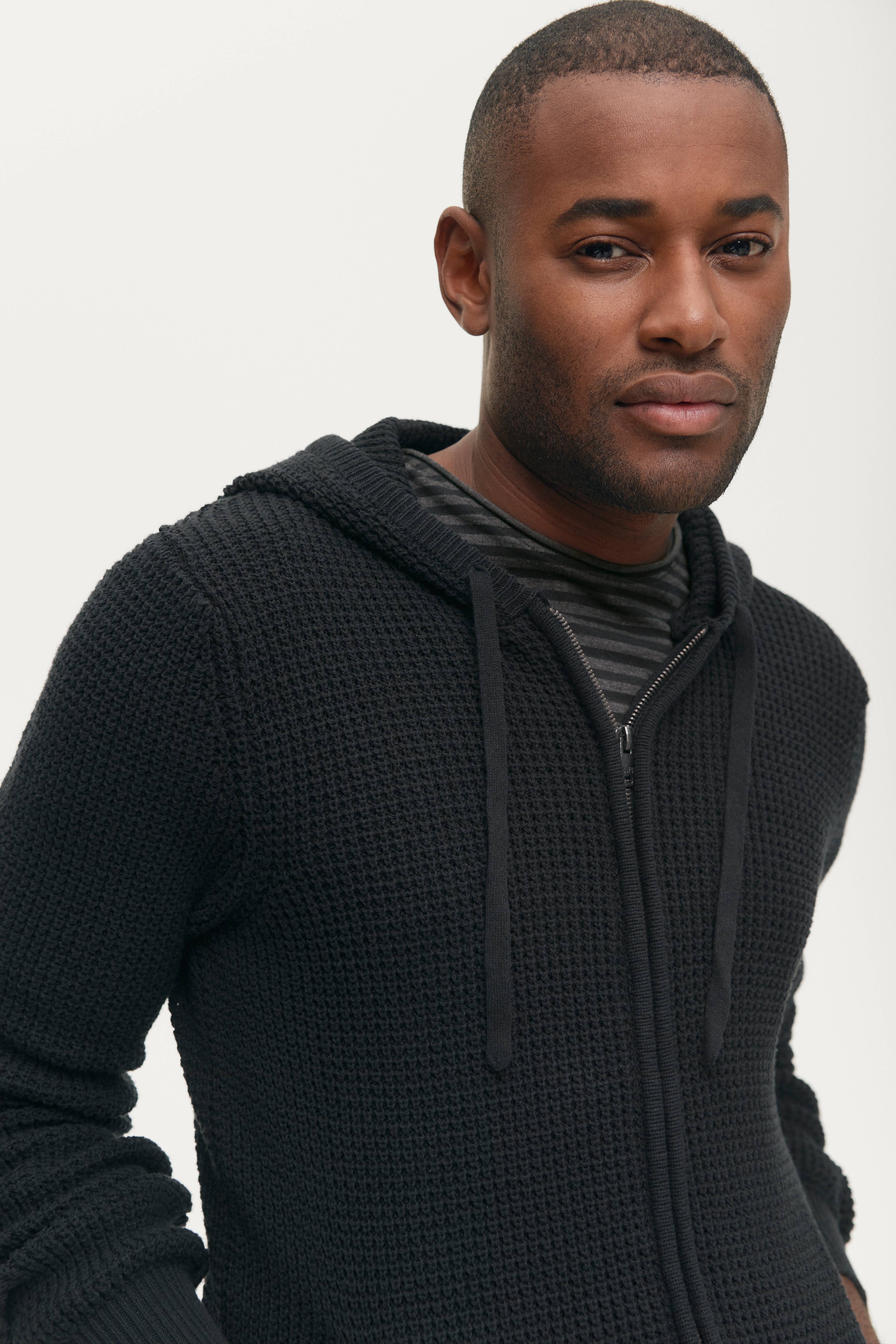 Hættetrøje Jackson fra Sons of Owen er strukturstrikket i bomuld og har en hellang lynlås. Hætte med løbegang. To lommer. Rib i ærmekant og forneden. Længde ca. 72 cm i str. M.