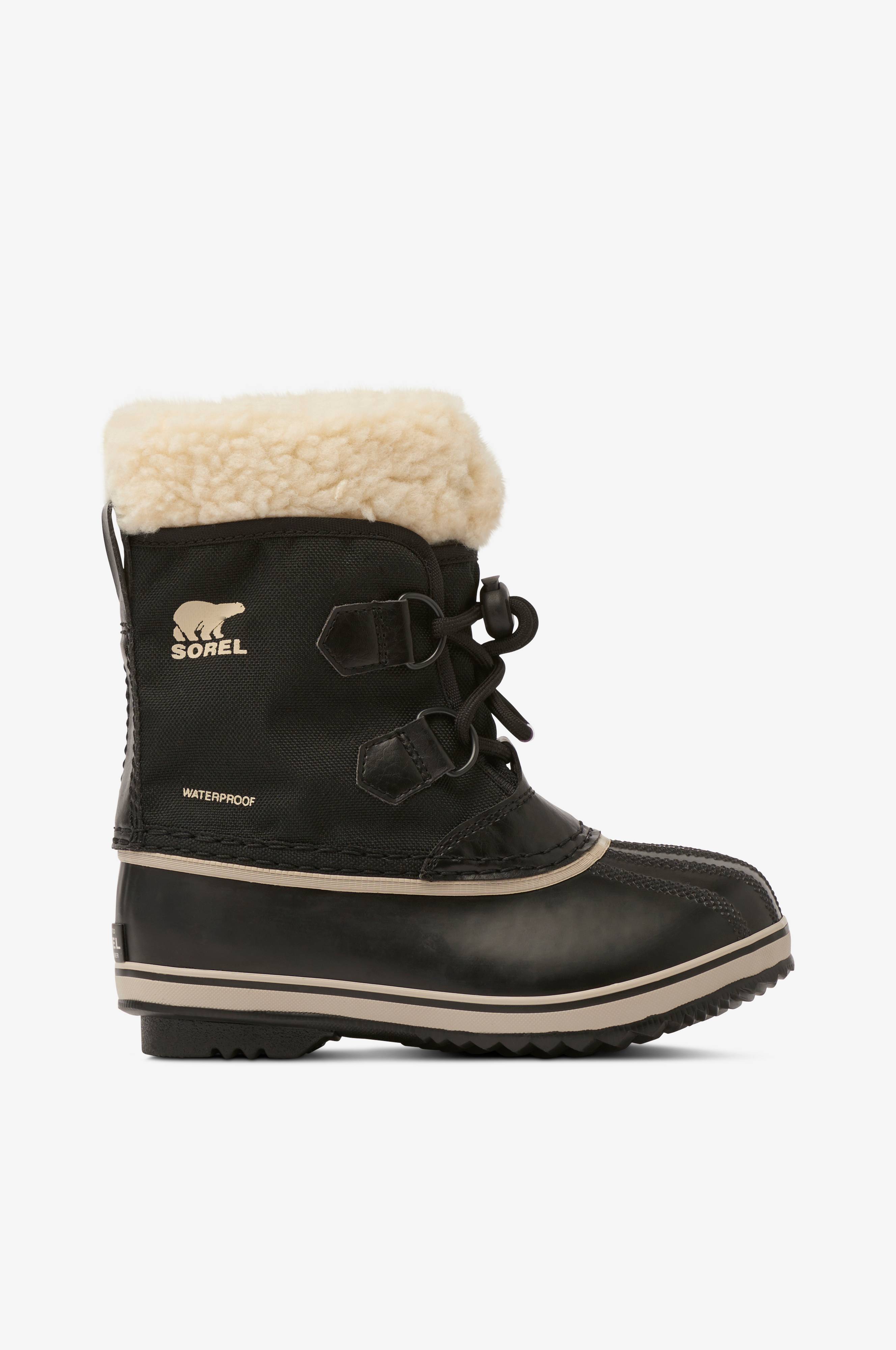 Støvler Childrens Yoot Pac fra Sorel er helt vandtætte med varmt for. Støvlen har helstøbt gummifod og skaft af polyamid med imprægnering, der gør støvlen vandtæt. Alle sømme er tapede. Snørebåndet løber gennem metalringe. Krave af plys. Varmt for med udtagelig og vaskbar indersok i termofilt som transporterer fugten væk og isolerer varmen. Indersokken er vaskbar. Mellemsål med kuldebarriere. Pløs med snefang. Strop bagpå på skaftkanten. Materialet tåler kulde ned til -40°. Skridsikker gummiydersål.