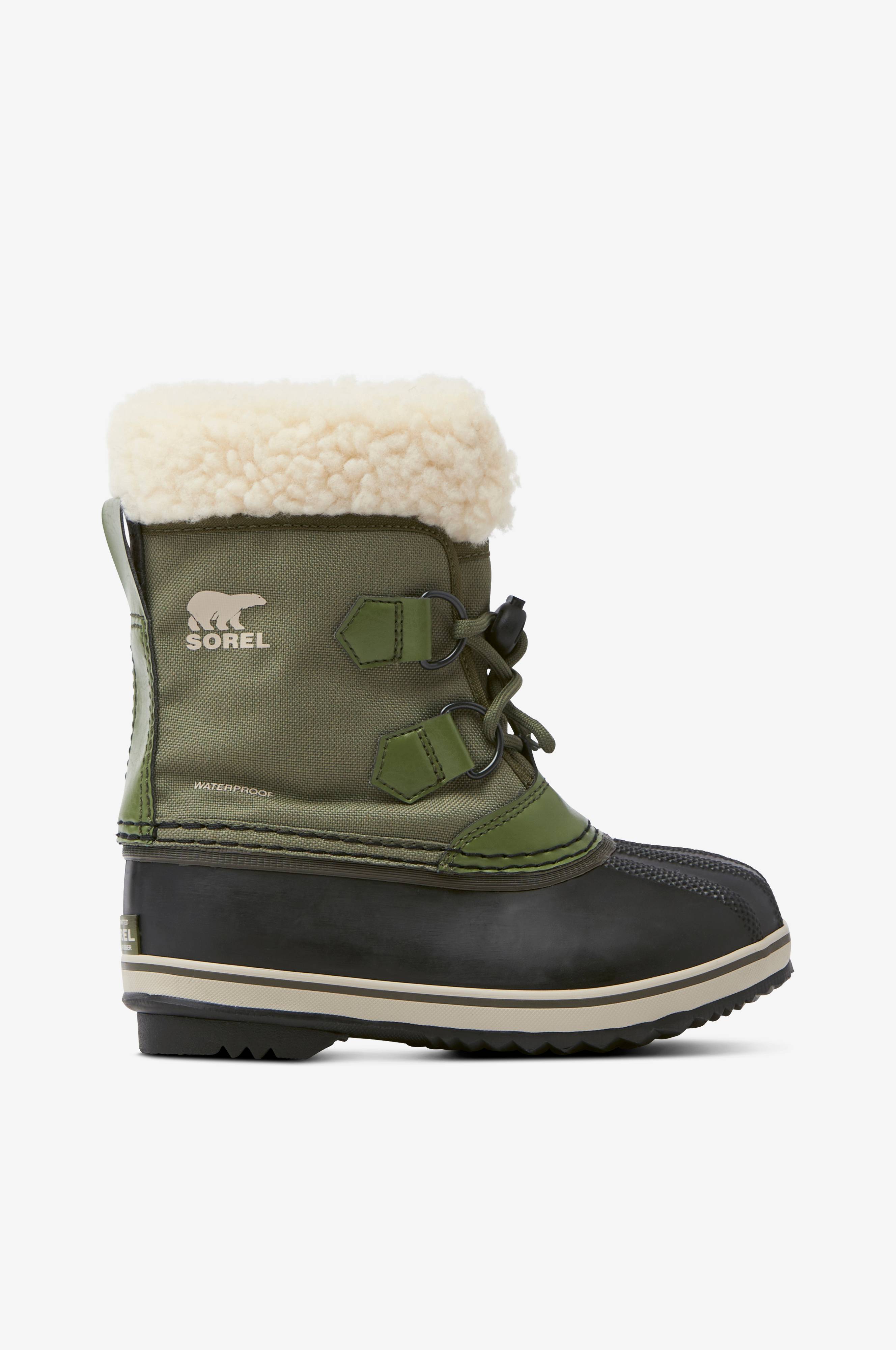 Støvler Childrens Yoot Pac fra Sorel er helt vandtætte med varmt for. Støvlen har helstøbt gummifod og skaft af polyamid med imprægnering, der gør støvlen vandtæt. Alle sømme er tapede. Snørebåndet løber gennem metalringe. Krave af plys. Varmt for med udtagelig og vaskbar indersok i termofilt som transporterer fugten væk og isolerer varmen. Indersokken er vaskbar. Mellemsål med kuldebarriere. Pløs med snefang. Strop bagpå på skaftkanten. Materialet tåler kulde ned til -40°. Skridsikker gummiydersål.