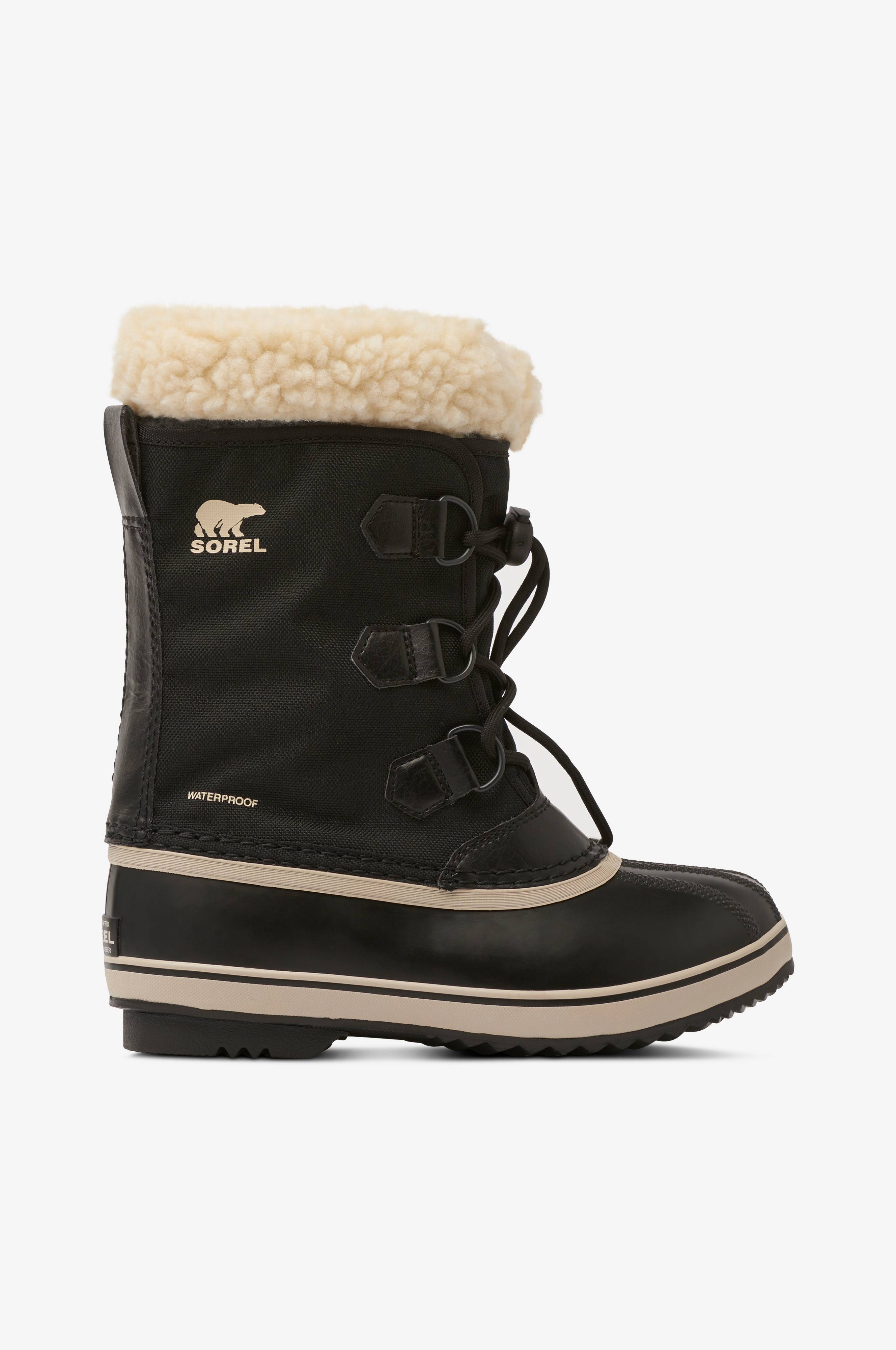 Støvler Yoot Pac fra Sorel er helt vandtætte med varmt for. Støvlen har helstøbt gummifod og skaft af polyamid med imprægnering, der gør støvlen vandtæt. Alle sømme er tapede. Snørebåndet løber gennem metalringe. Krave af plys. Varmt for med udtagelig og vaskbar indersok i termofilt som transporterer fugten væk og isolerer varmen. Indersokken er vaskbar. Mellemsål med kuldebarriere. Pløs med snefang. Strop bagpå på skaftkanten. Materialet tåler kulde ned til -30°. Skridsikker gummiydersål.