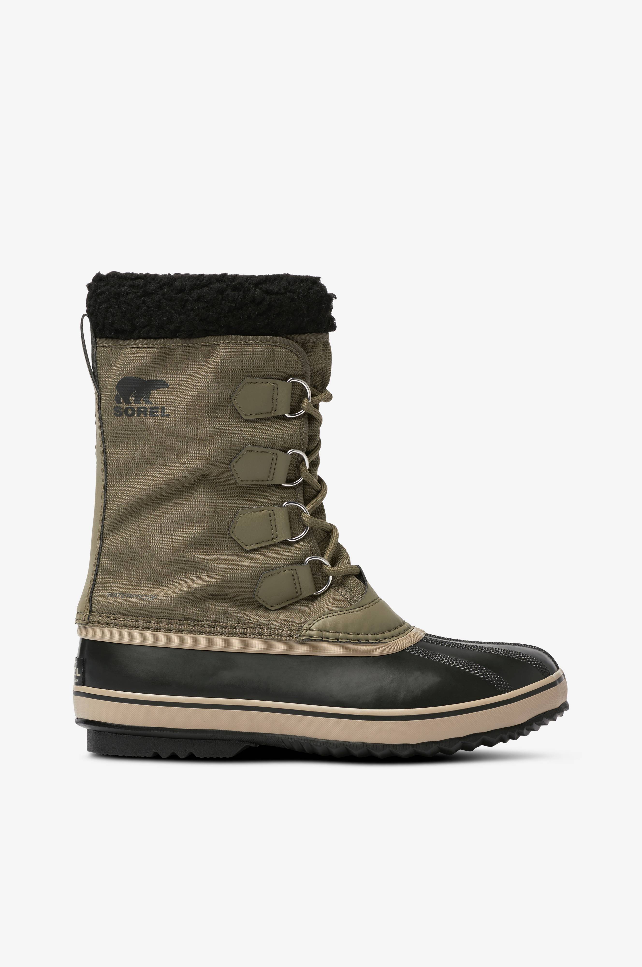 Vinterstøvle 1964 Pac Nylon fra Sorel er helt vandtæt og varmforet. Støvlen har helstøbt gummifod og skaft af polyamid med coating som gør støvlen vandtæt. Snørebåndet løber gennem store metalringe. Varmt for med udtagelig indersok i termofilt som transporterer fugten væk og isolerer varmen. Indersokken er vaskbar og har blødt plysfor foroven. Mellemsål med kuldebarriere og pløs med snefang. Materialet isolerer ned til -40 °C. Skafthøjde 24 cm.