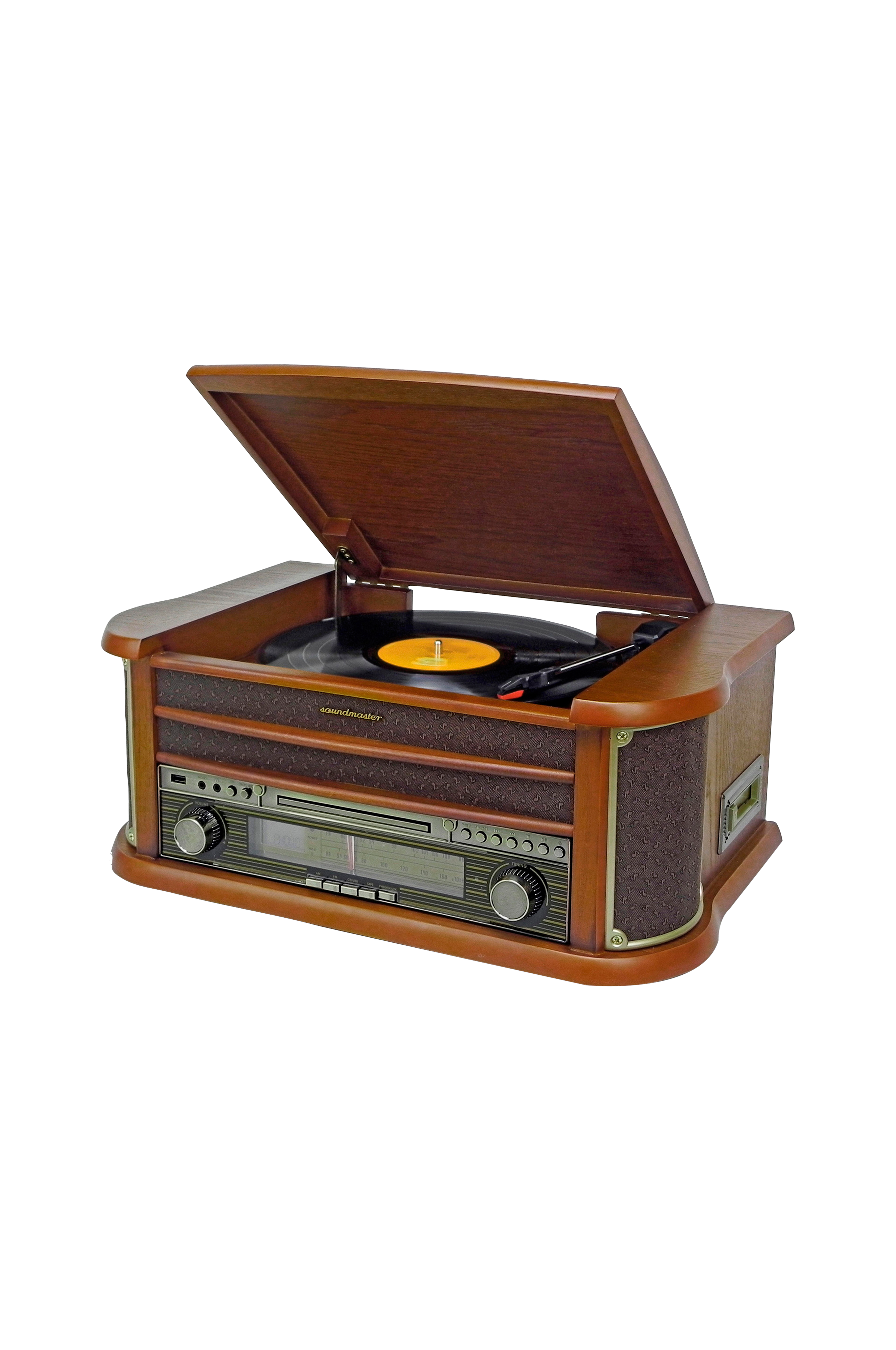 Stereoanlæg i retrostil med pladespiller, radio, CD og kassetteafspiller.
