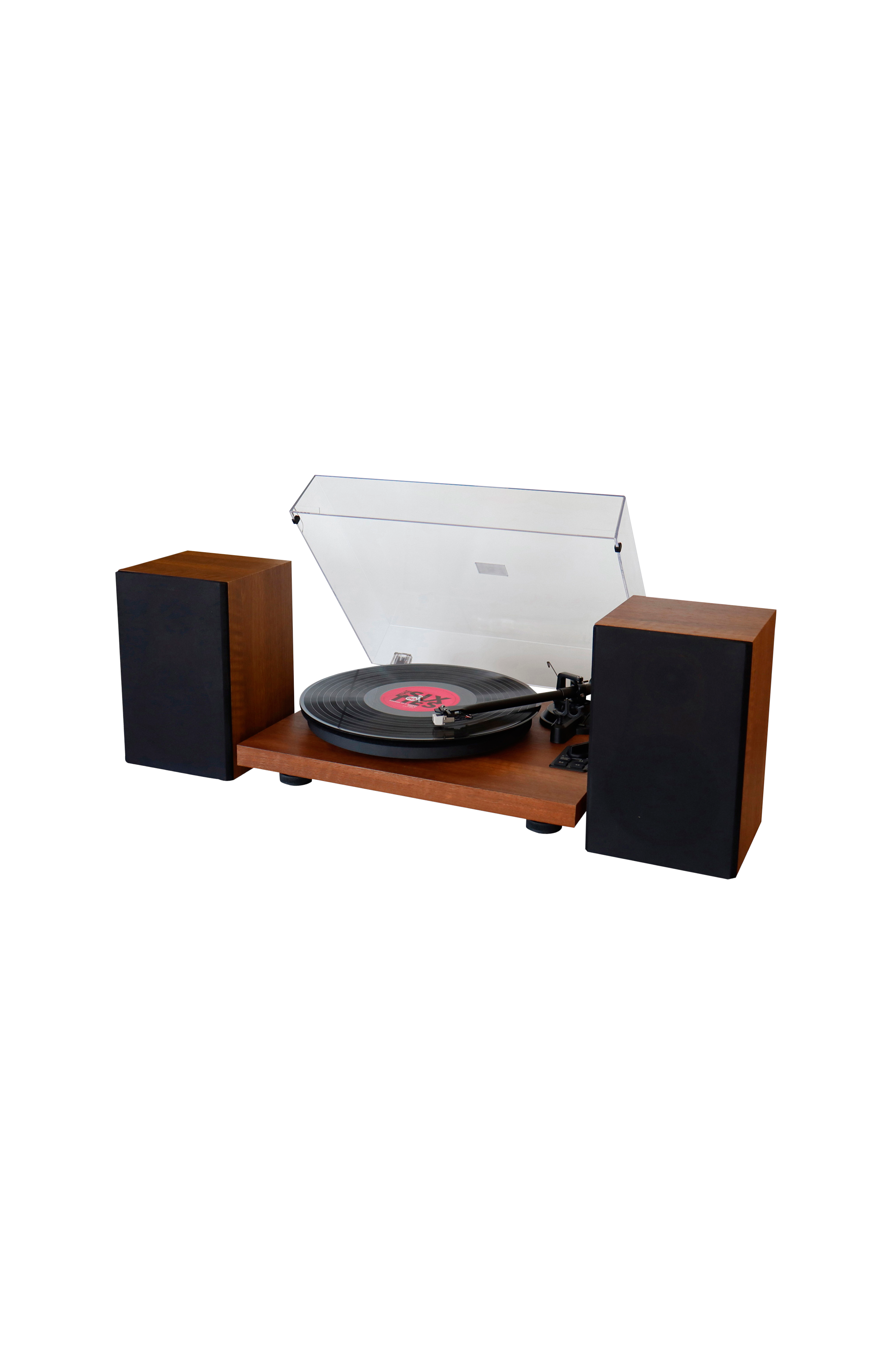 Pladespiller med indbygget forstærker og medfølgende højttaler