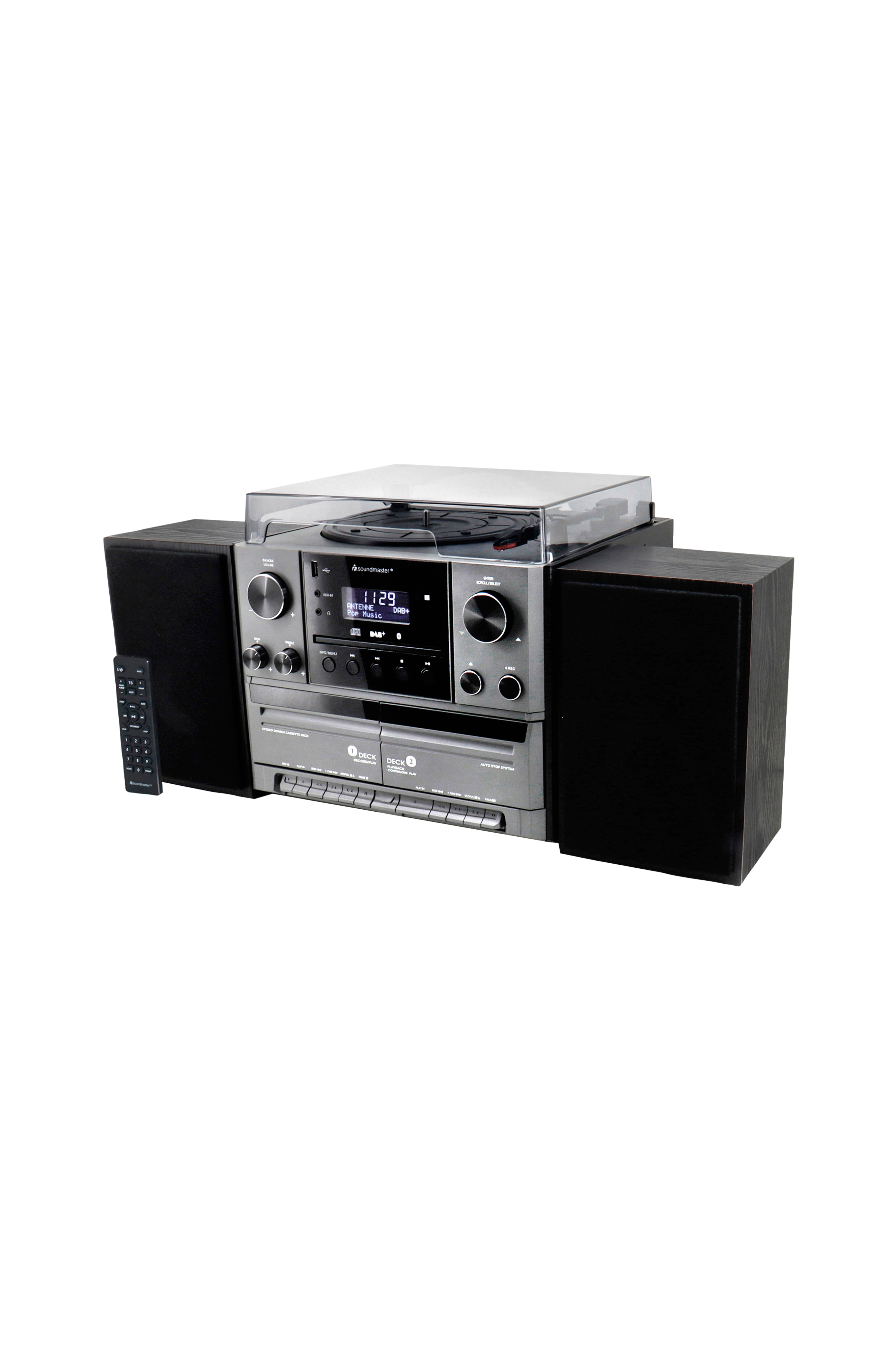 Klassisk stereoanlæg med pladespiller, cd, radio, dobbeltkassette og højttalere.