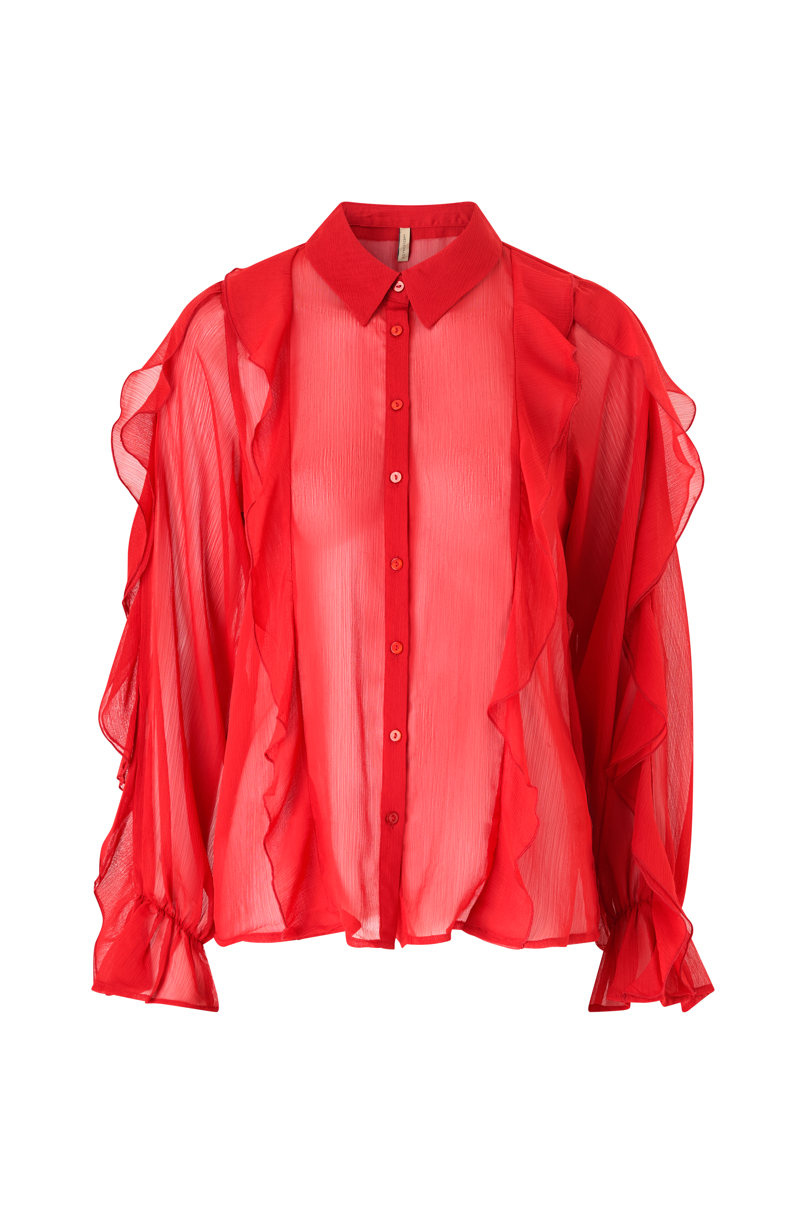• Semitransparent bluse med volantdetaljer• Krave• Lange ærmer• Knaplukning
