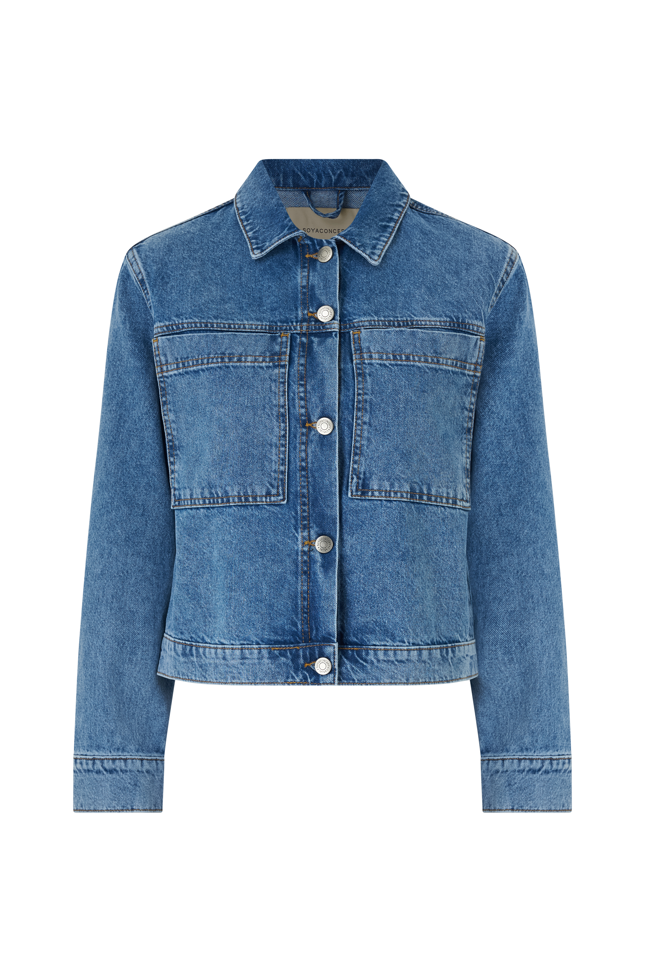 Flot og meget behagelig denimjakke med passende længde og fine store lommer foran