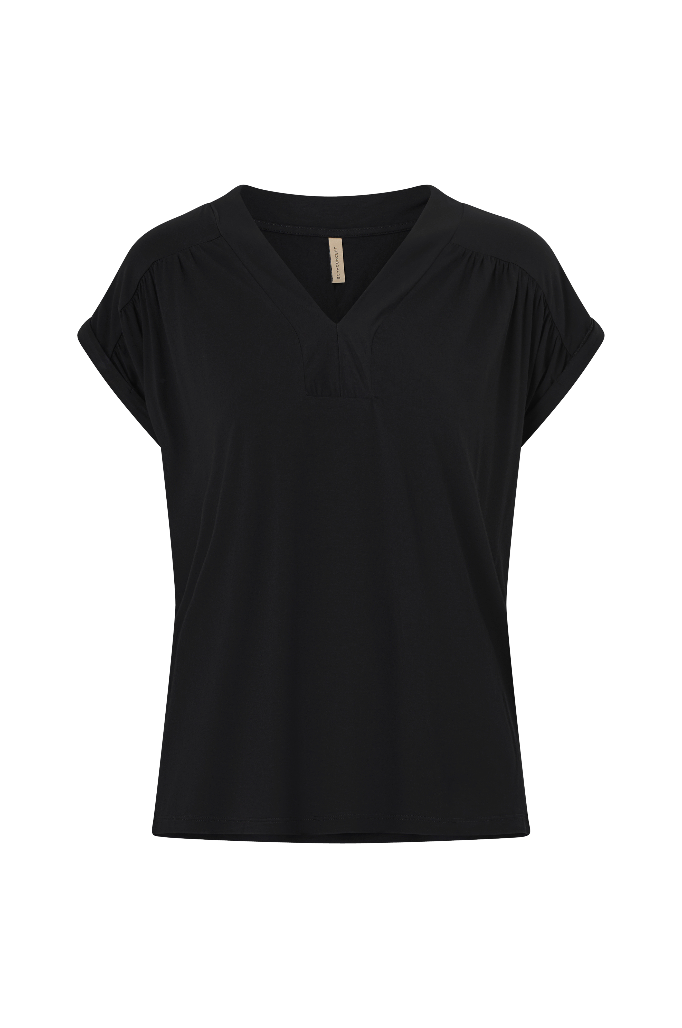 • Lige model• V-formet halsudskæring med indlæg• Samling foran på skuldrene• Kort ærme med fæstet oprullet