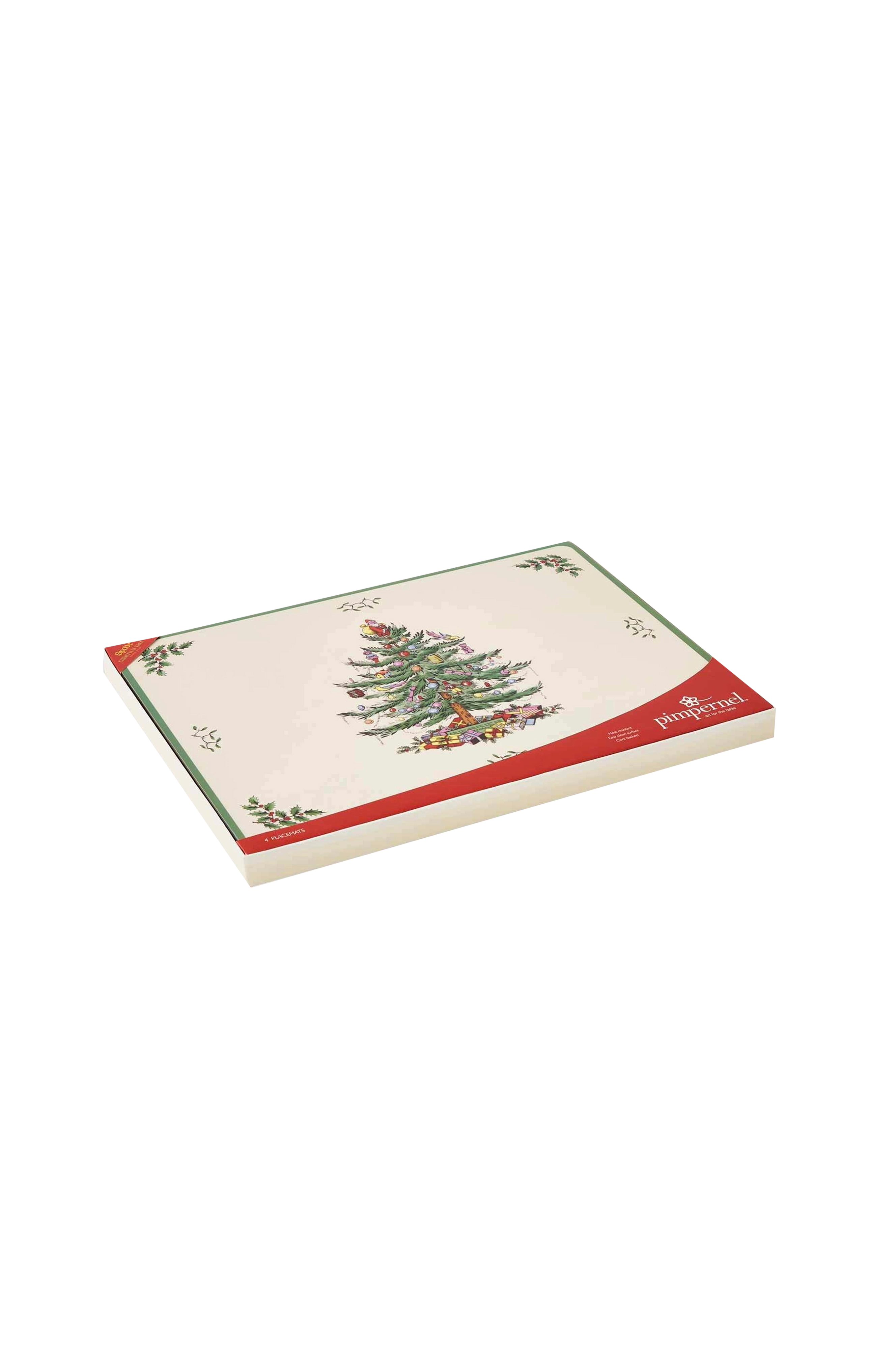 4 dækkeservietter i serien Christmas Tree. Dækkeservietterne er lavet i et lagsystem med korkbagside, der beskytter dine møbler, MDF i midten og fuldt forseglet overside, der både er plet- og varmebestandige, op til 100°C.