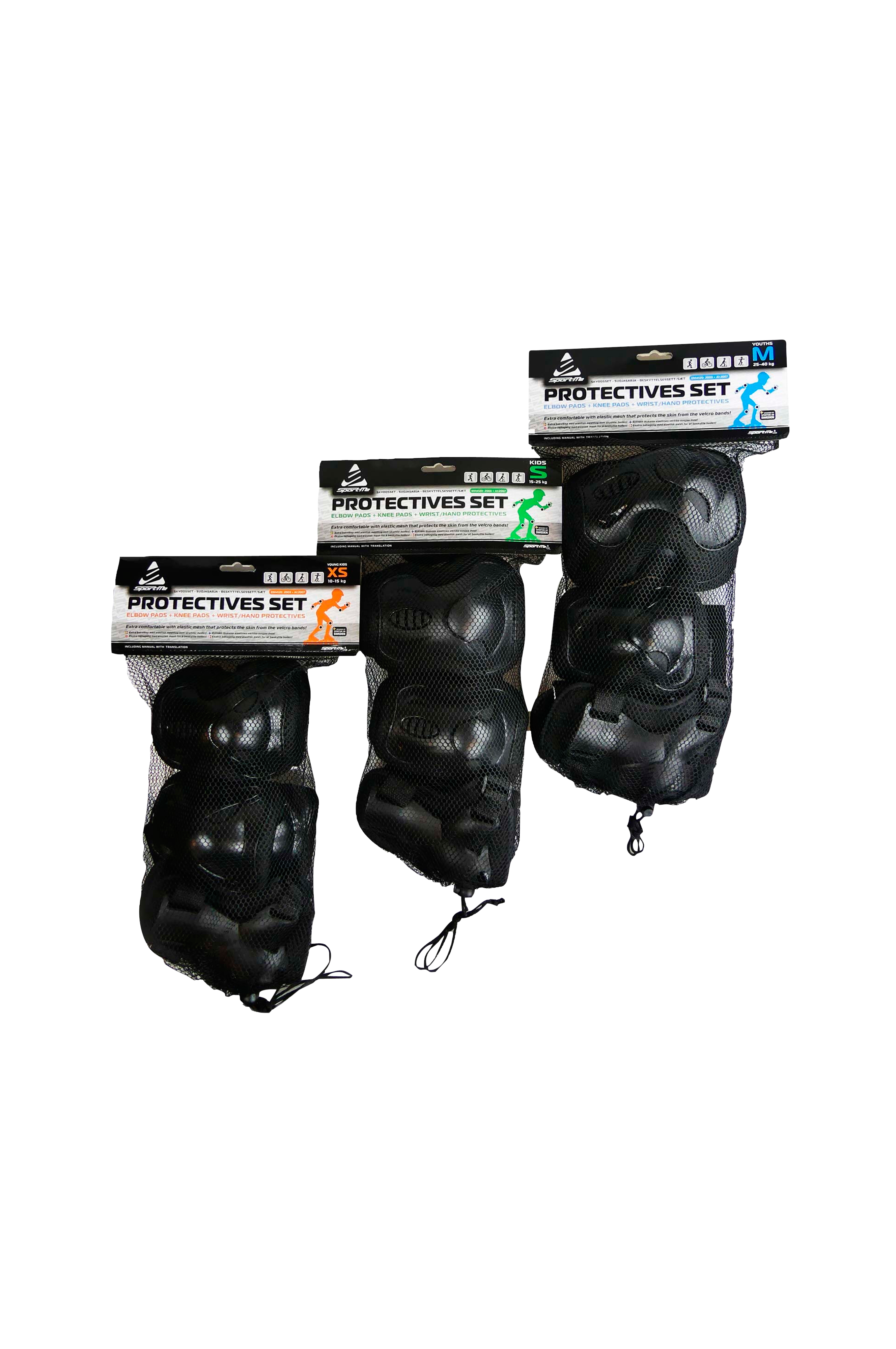 Beskyttelsessæt med knæbeskyttere, albuebeskyttere og håndleds-/håndbeskyttelse.