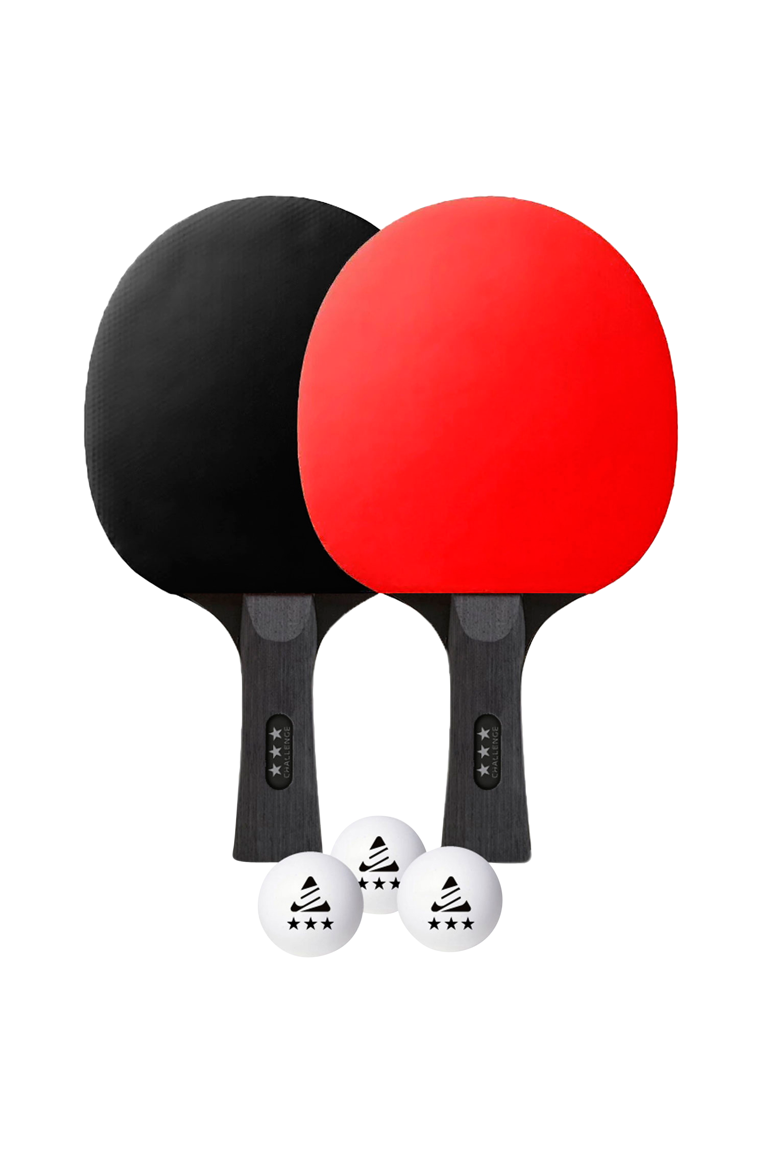 Indeholder: • 2 trestjernede ketsjere med balance i følelse, kontrol og kraft. • 3 ABS 40+ bordtennisbolde af høj kvalitet. • Ketsjerens materiale: Premium ply poppeltræ • Håndtag: Konkav form for greb og kontrol • Ketsjergummi og svamp: 1,8 mm svamp, 1,4 mm ydre lag • Ketsjerens vægt: 170 g • Boldvægt: 2,67-2,77 g • Boldfarve: Hvid • Stjernebedømmelse: 3 stjerner (ketcher og bold).