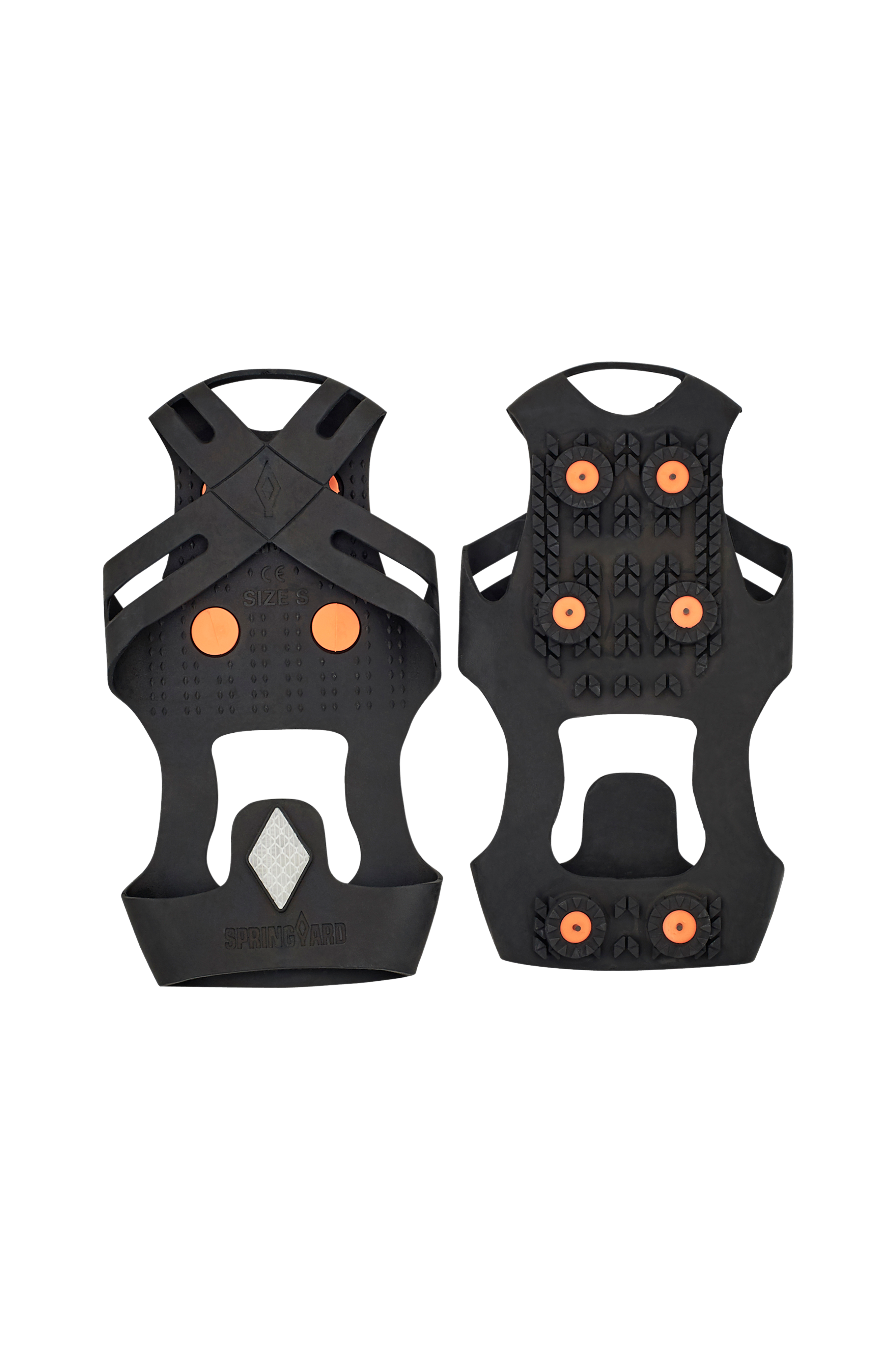 Pigsåler Runsafe Sportgrip fra Springyard. En teknisk avanceret helfodsbeskyttelse med 3M-refleks, udviklet til at give maksimalt greb ved løb på is og sne. Både på lange ture og ved løb i intervaller. Tætsiddende pasform og gennemtænkt design giver sikker løbefølelse. Fremstillet af slidstærkt naturgummi med slidstærke, udskiftelige dupper i tungstenkarbid. Mønstret underside. Passer alle typer af løbesko. Kan være glatte på sten- og metaloverflader. Kun til udendørs brug. Undgå brug på bar jord for at minimere slitage. Opbevaringspose medfølger.
