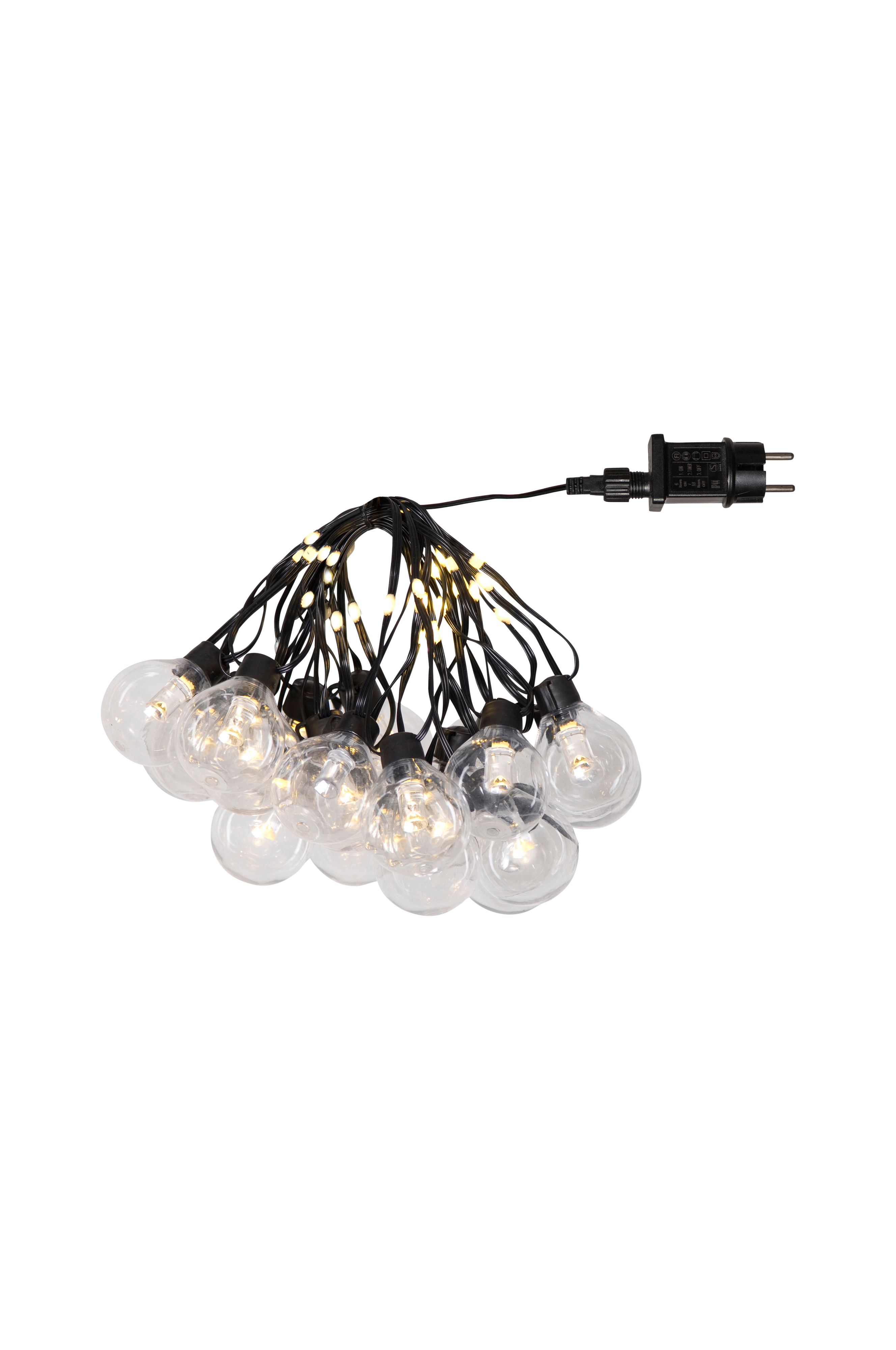 Lyskæde til udendørs brug med 20 farvede kugler, der er 4 cm i diameter, mellem hver kugle er der yderligere 2 lyspunkter på kablet, alle lyspunkter har en flerfarvet glød. Velegnet til både hverdag og fest. Tyndere sort fladkabel med 10 cm mellem hvert lyspunkt. Lyskæden har 8 forskellige blinkende funktioner, vælg nemt din favorit ved at trykke på knappen på transformeren.