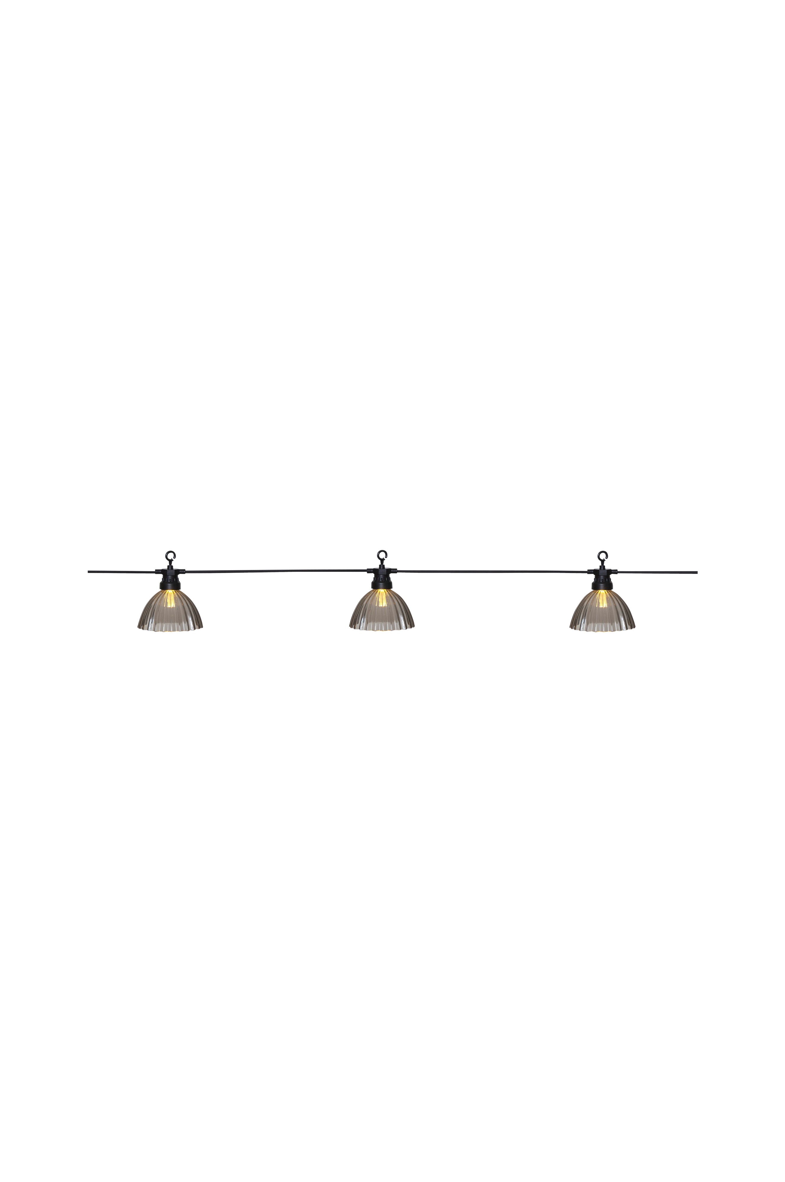 Flot lyskæde med 12 røgfarvede lyskilder i form af en lille lampeskærm. Skøn lyskæde at pynte op med til hverdag og til fest. Giver et smukt lysskær i mørket. Transformator: 3V DC 2.1W, IP44, Schuko-stik. Tilslutningskabel på 500 cm. Afstanden mellem lamperne er 45 cm.