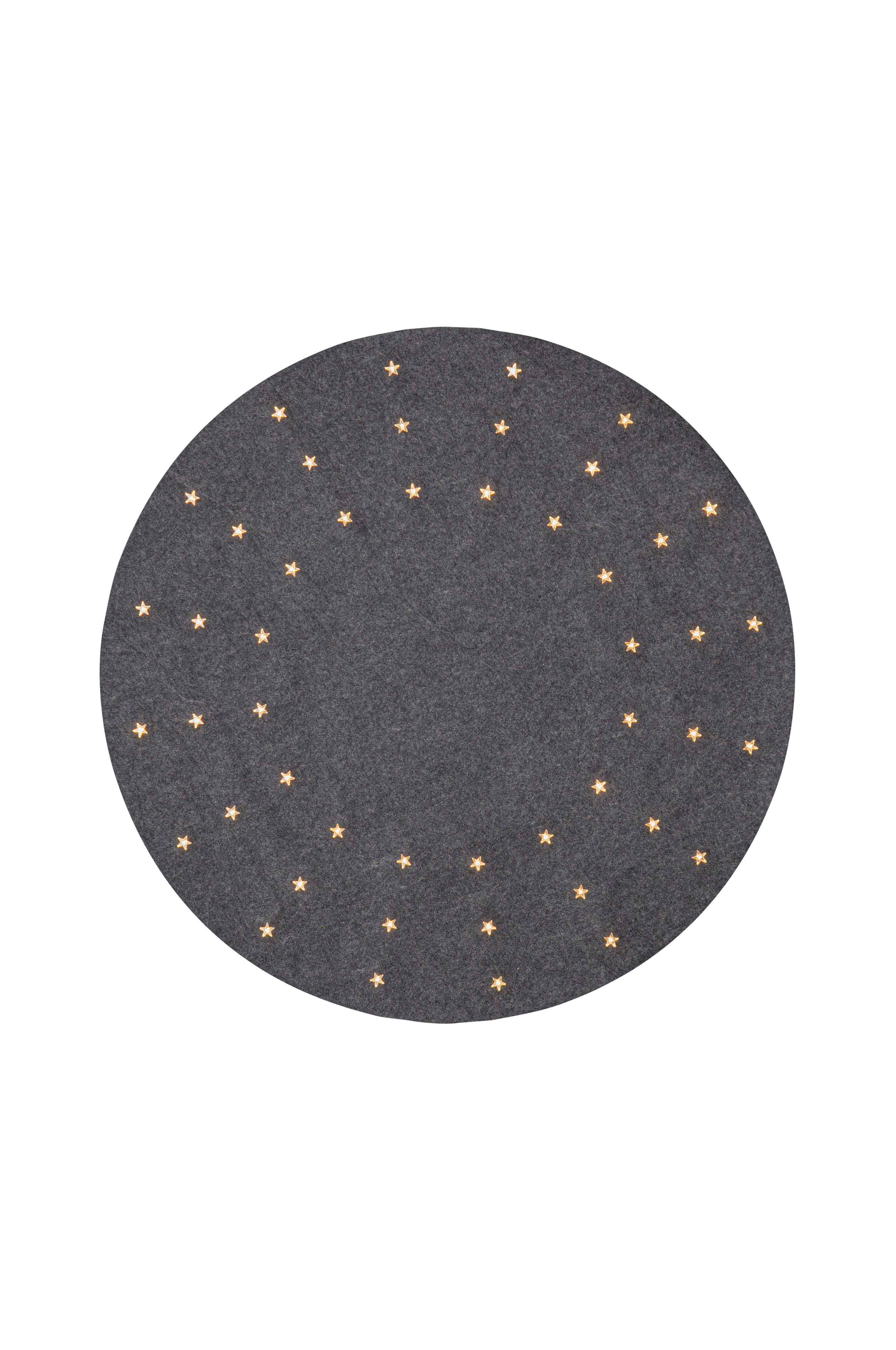 Juletræstæppe med 48 varme LED-lamper. Lamperne lyser igennem de gennemsigtige stjerner som sidder i tæppet. En smuk dekoration under juletræet. Ø 80 cm. Lampernes spænding 3V. Volt 4,5V.