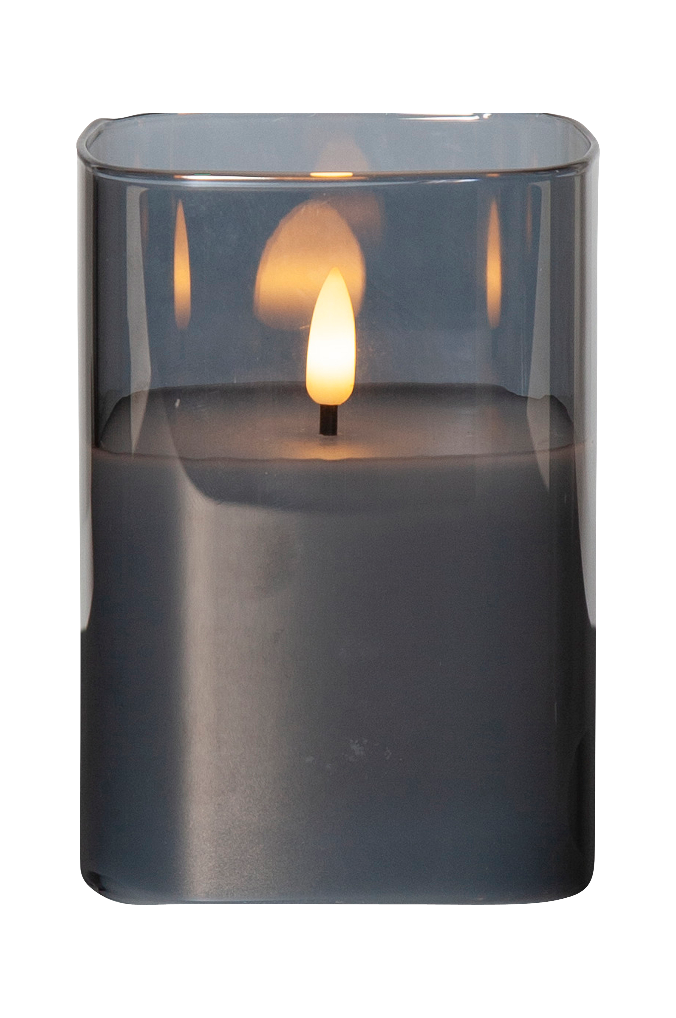 Vores fine Flamme-lys med naturtro lue lyder med et varmt hvidt skær, her med en holder i glas som vokslyset er monteret i. Højde 12,5 cm, bredde 9 cm og dybde 9 cm. Bruger 2 AA-batterier, medfølger ikke. Timer 6 t tændt, 18 t slukket, repeterende. IP20.