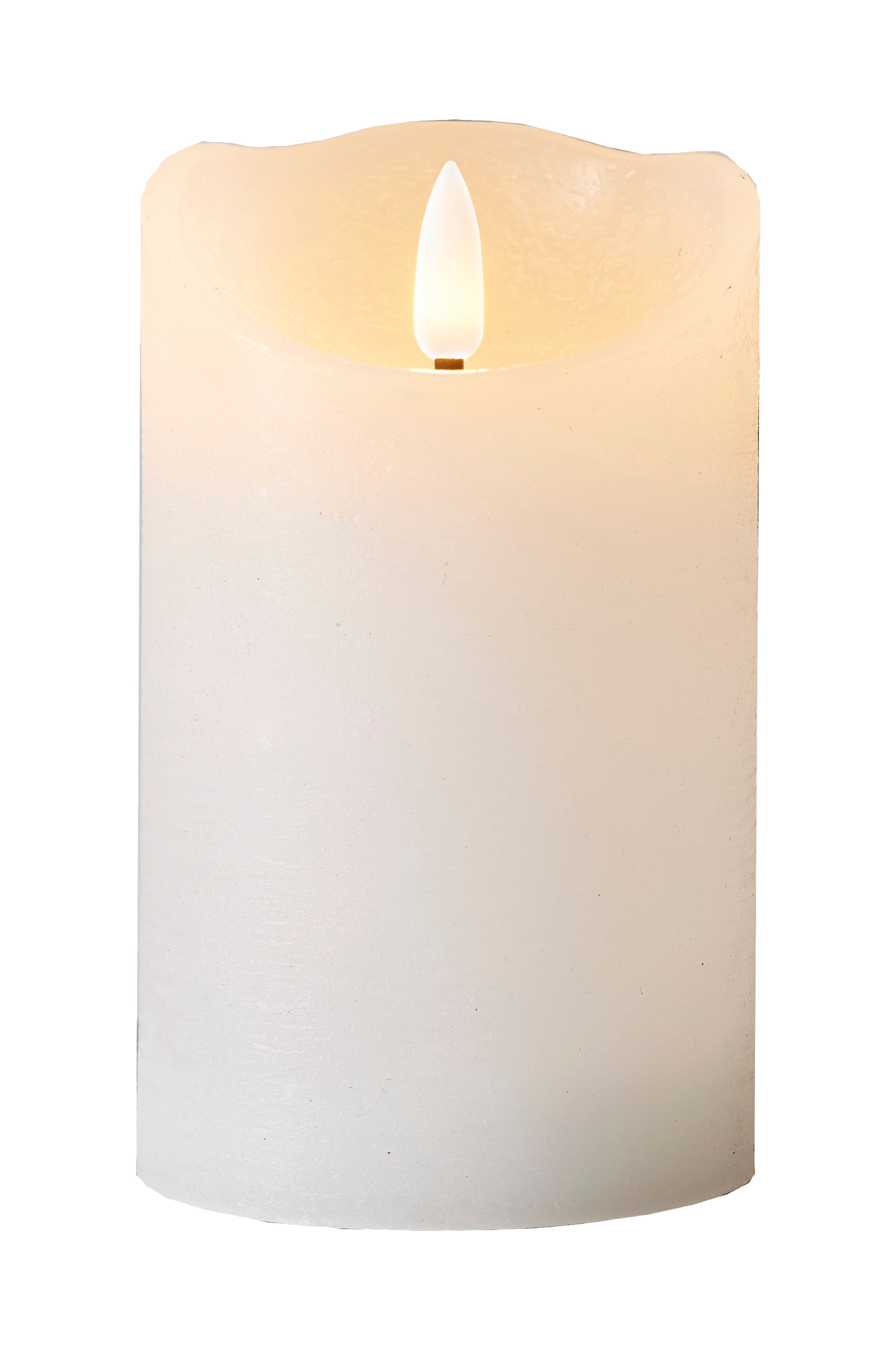 Hvidt vokslys med rustik overflade i vores flamme-serie. Den naturtro flamme skinner med en varm hvid glød. Med indbygget timer. Undgå at placere lysene i direkte sollys, da de kan smelte og blive misfarvede af varmen.
