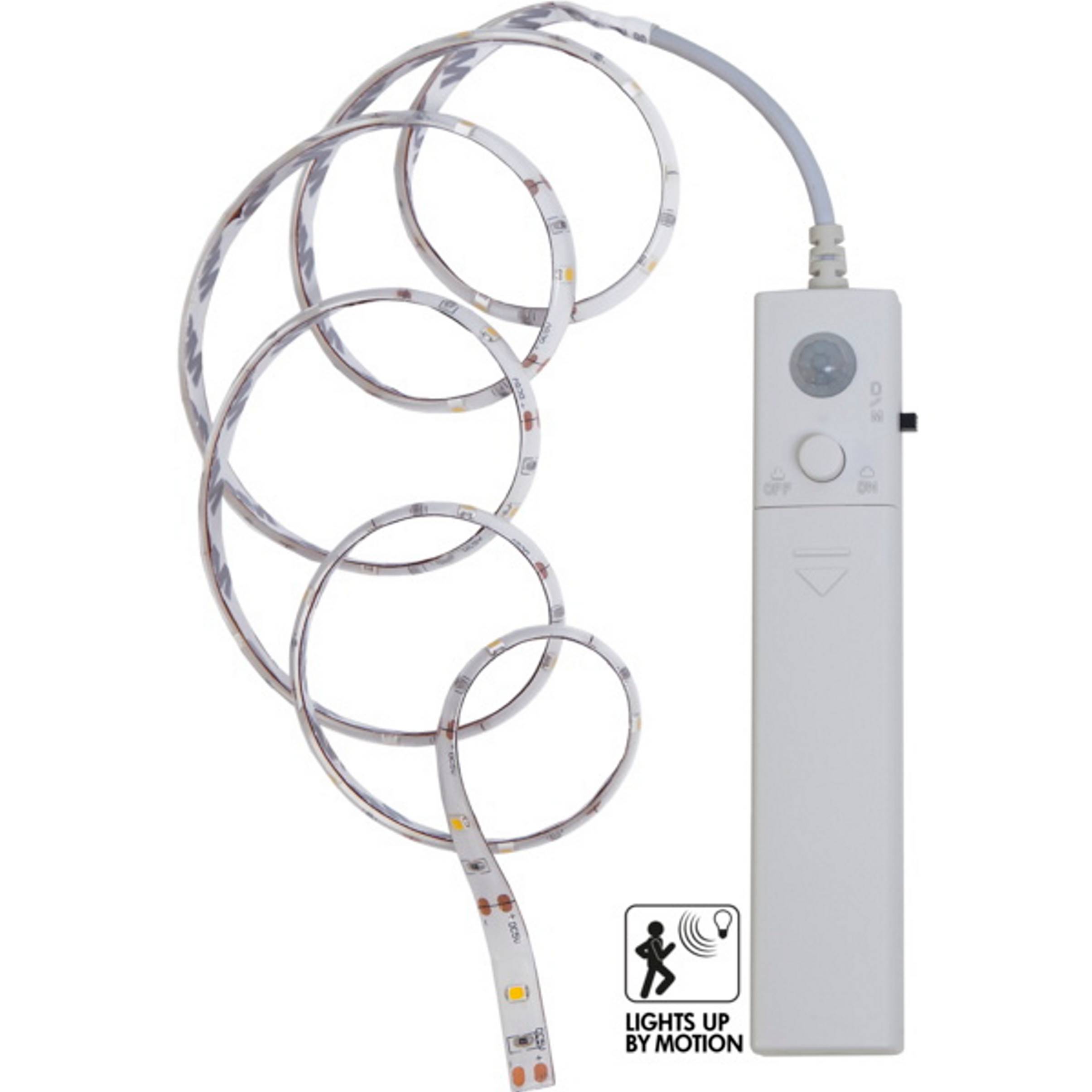 Batteridrevet led-strip på 1 m. Varmt hvidt lys, der enten tændes ved bevægelse eller konstant. Let at installere under sengen eller i et skab med tape på bagsiden af strip og batteriboks.
