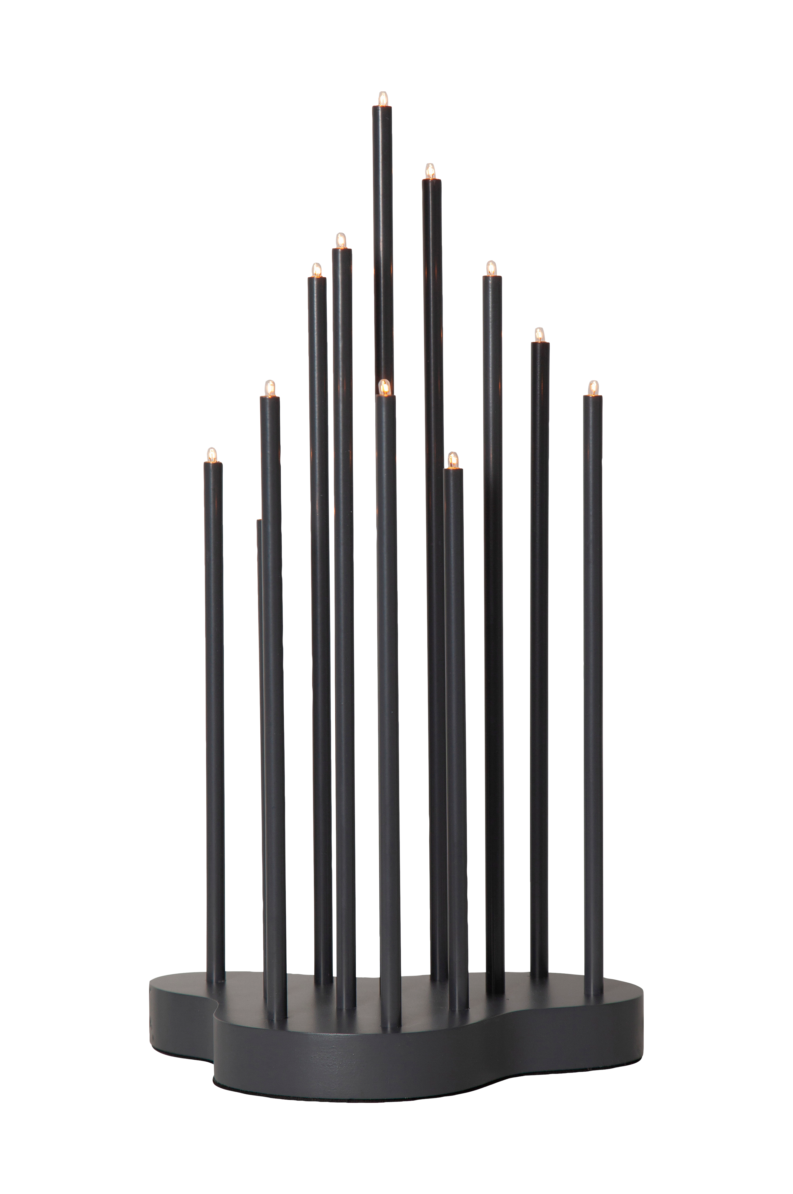 Stilren lysestage med kraftig base i træ. Lysrør af tynde metalrør. 12 lyskilder, e5 pærer. Lysestage i hvid farve. Stofledning i hvid/grå. Giver et skønt, stemningsfyldt lys hele året rundt.