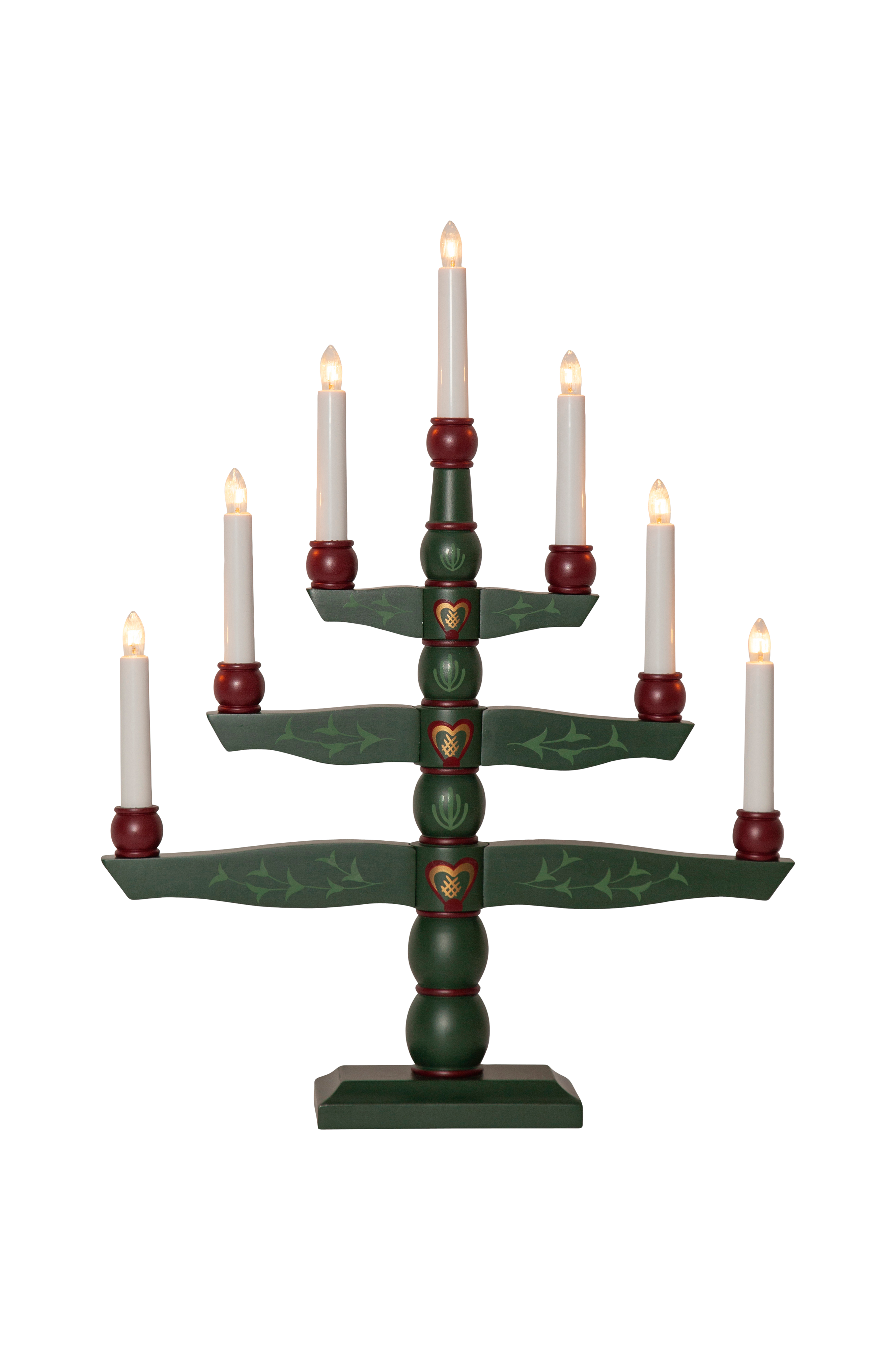 Traditionel trælysestage med malede dekorative detaljer. Stil lysestagen i vinduet for at skabe en dejlig adventsstemning i boligen. Lysestagen har 7 lyskilder og en ledningslængde på 180 cm.