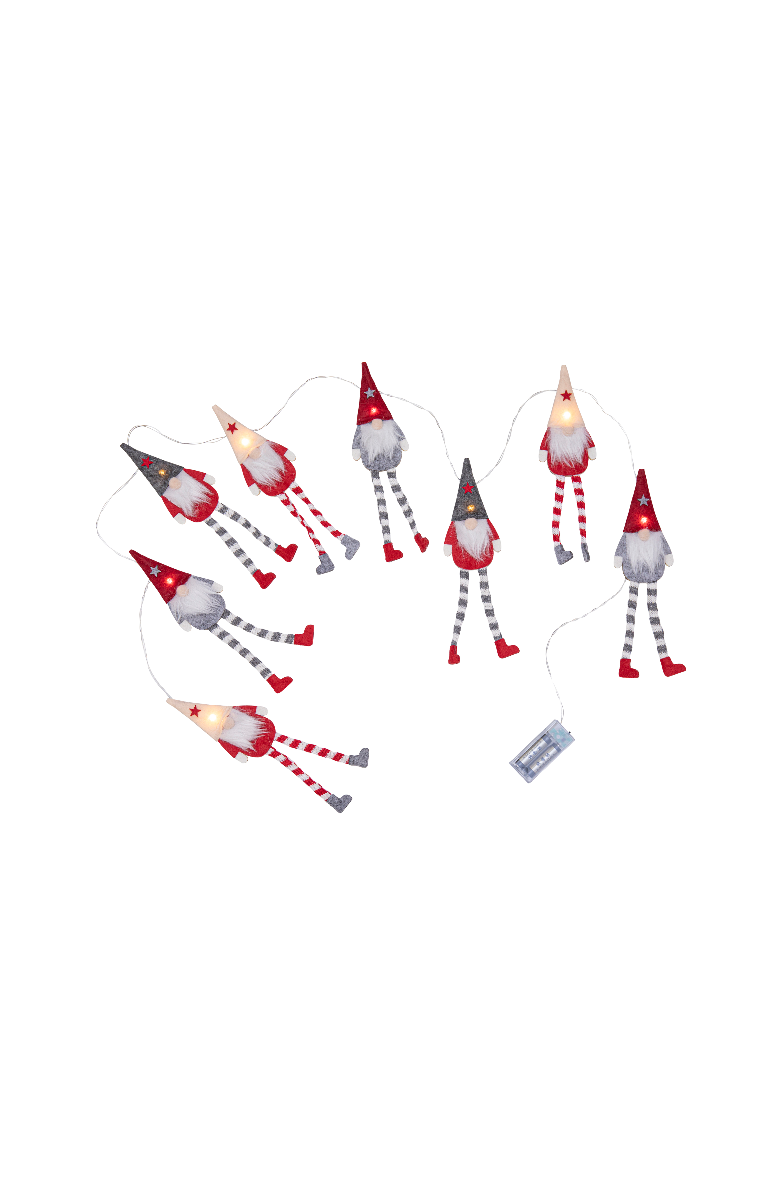 Batteridrevet lyskæde med 8 stk. større julemandsdekorationer af træ og stof i julefarver. Varm hvid led giver et hyggeligt lys. Timerfunktion i batteriboks. Pynt f.eks. juletræet eller brug det som borddekoration.