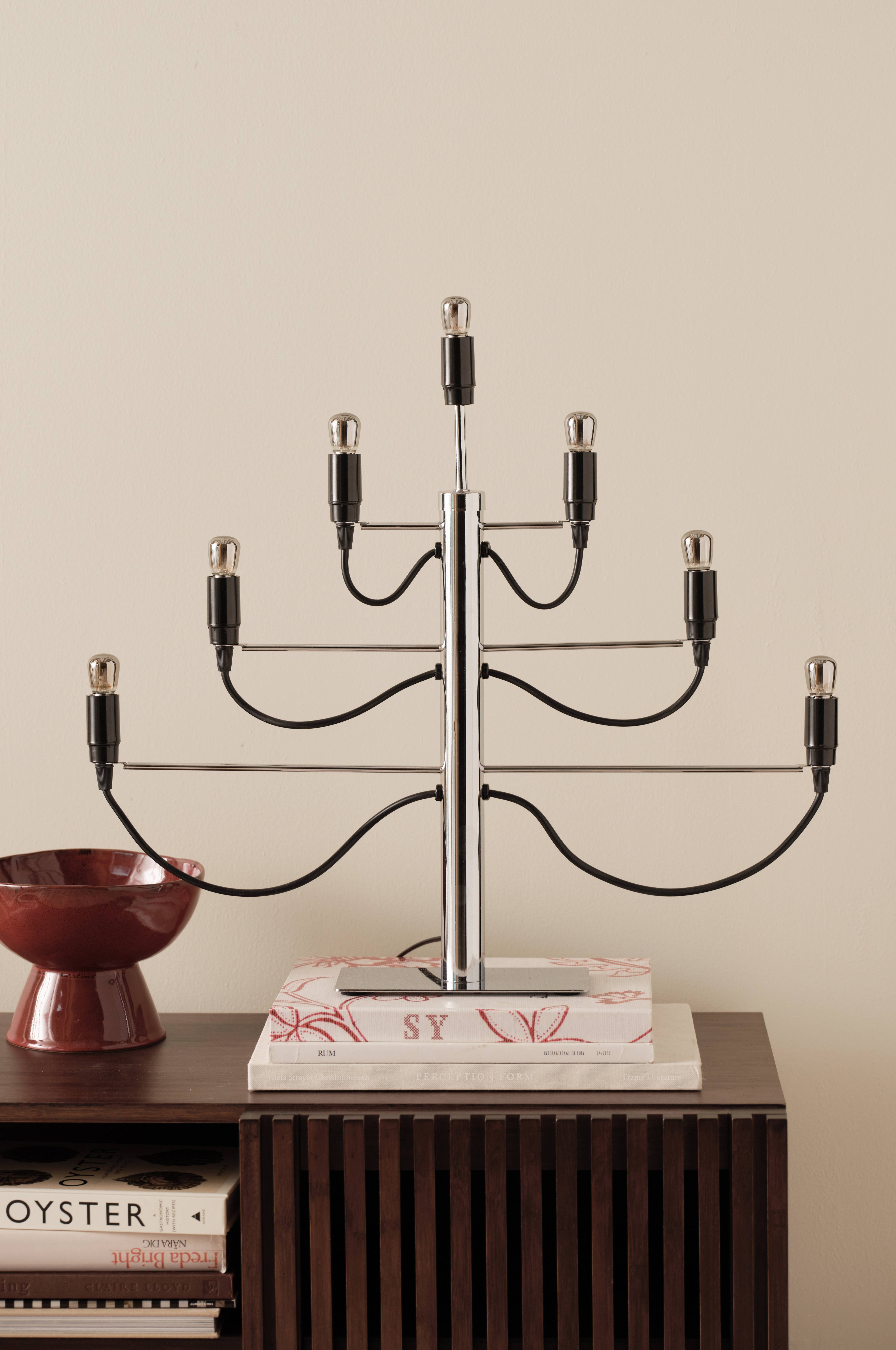 Stilfuld og moderne lysestage i metal med 7 lyskilder. Spreder dejligt lys og giver dit hjem et moderne præg. Tilslutningskablet er 180 cm langt. Lyskilden er 2000k og har en lysstrøm på 30lm.