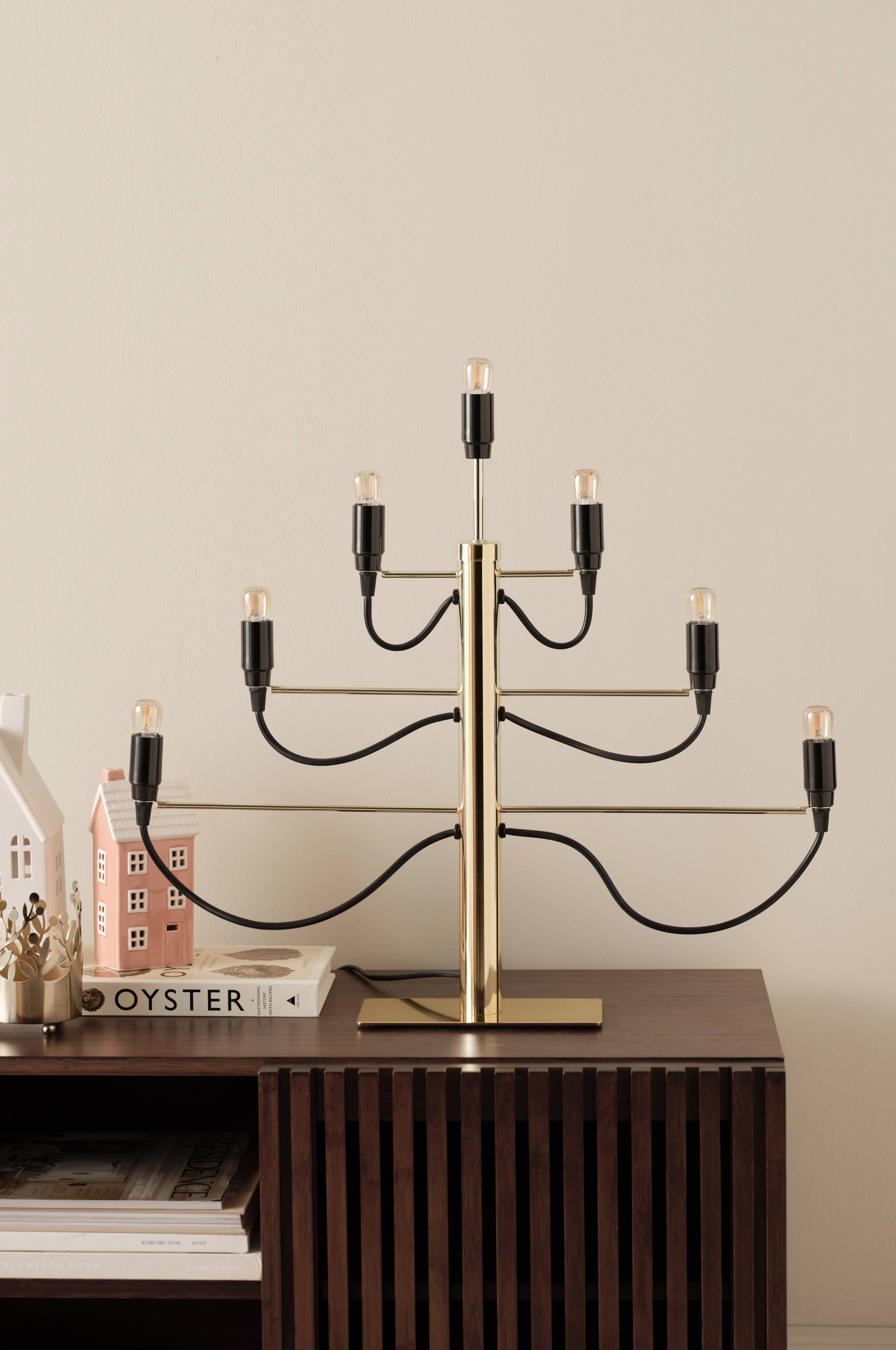 Stilfuld og moderne lysestage i metal med 7 lyskilder. Spreder dejligt lys og giver dit hjem et moderne præg. Tilslutningskablet er 180 cm langt. Lyskilden er 2000k og har en lysstrøm på 30lm.