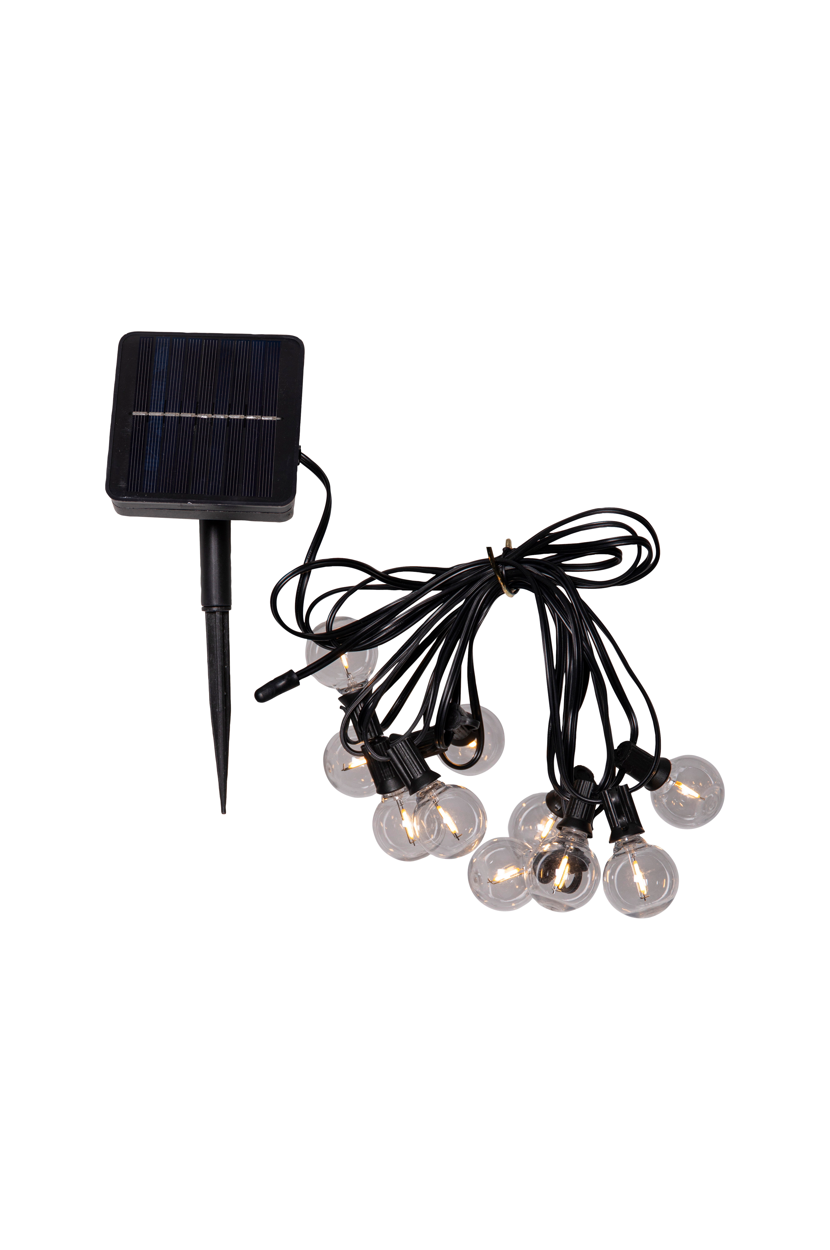 Sollyskæden globe mini har 10 små kugler, der er lavet af gennemsigtig pc-plast. Kuglerne er ca. 4 cm i diameter med et 30 cm langt kabel imellem. Den lyser op med glødetråd i et varmt hvidt skær i mørket. Solcellebelysningen er perfekt til at placere som dekoration i haven, på altanen eller terrassen. Selve paneldelen sidder med et 200 cm langt kabel fra den sidste kugle, hvilket gør det nemt at placere panelet i direkte sollys, hvilket er nødvendigt for at få den ultimative opladning af det medfølgende batteri.