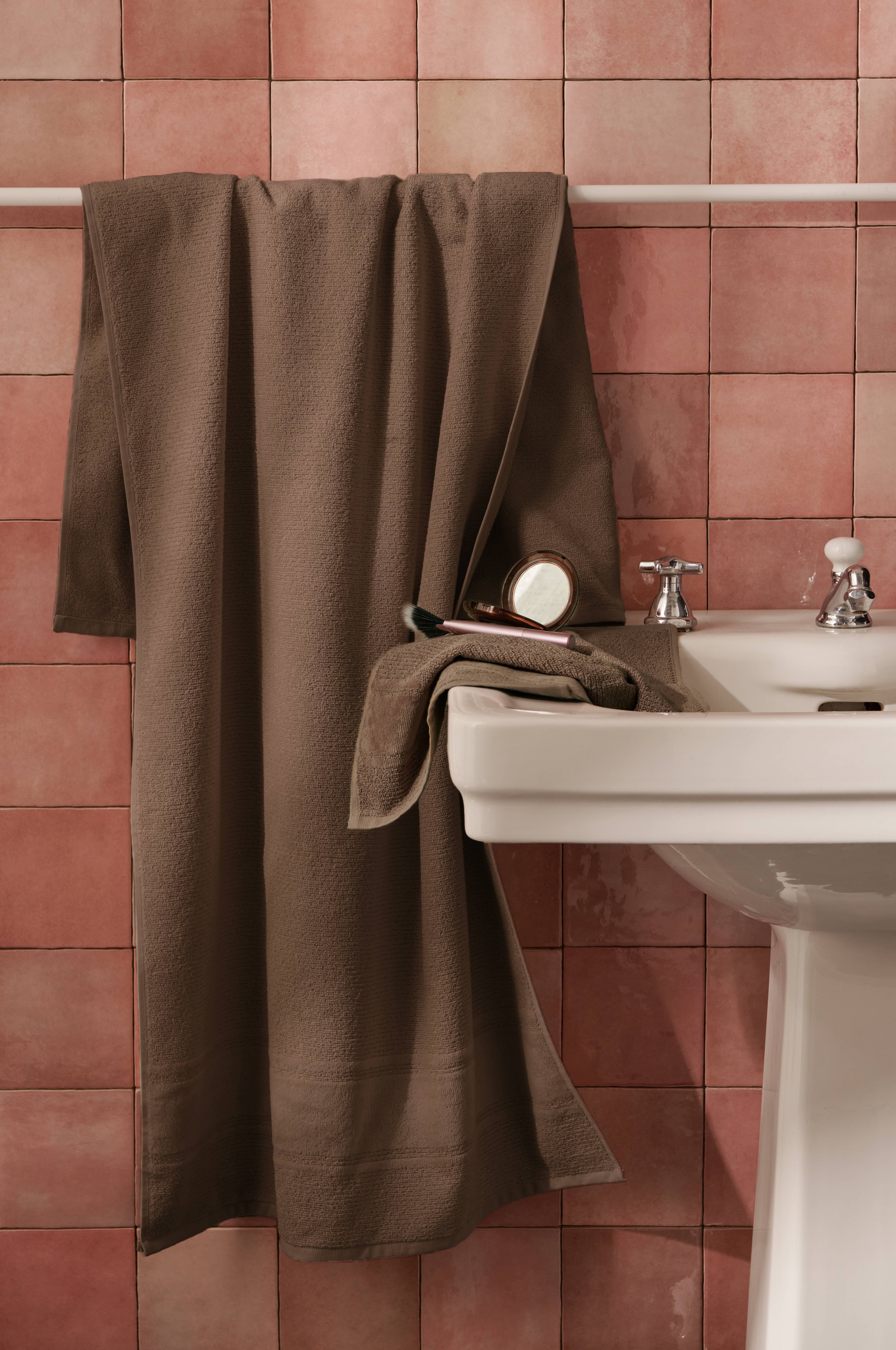 Badehåndklæde af blød bomuldsfrotté med let struktur og stribe i velour forneden. Str. 70x140 cm. Vægt 520 g/m2. Fremstillet i Portugal.