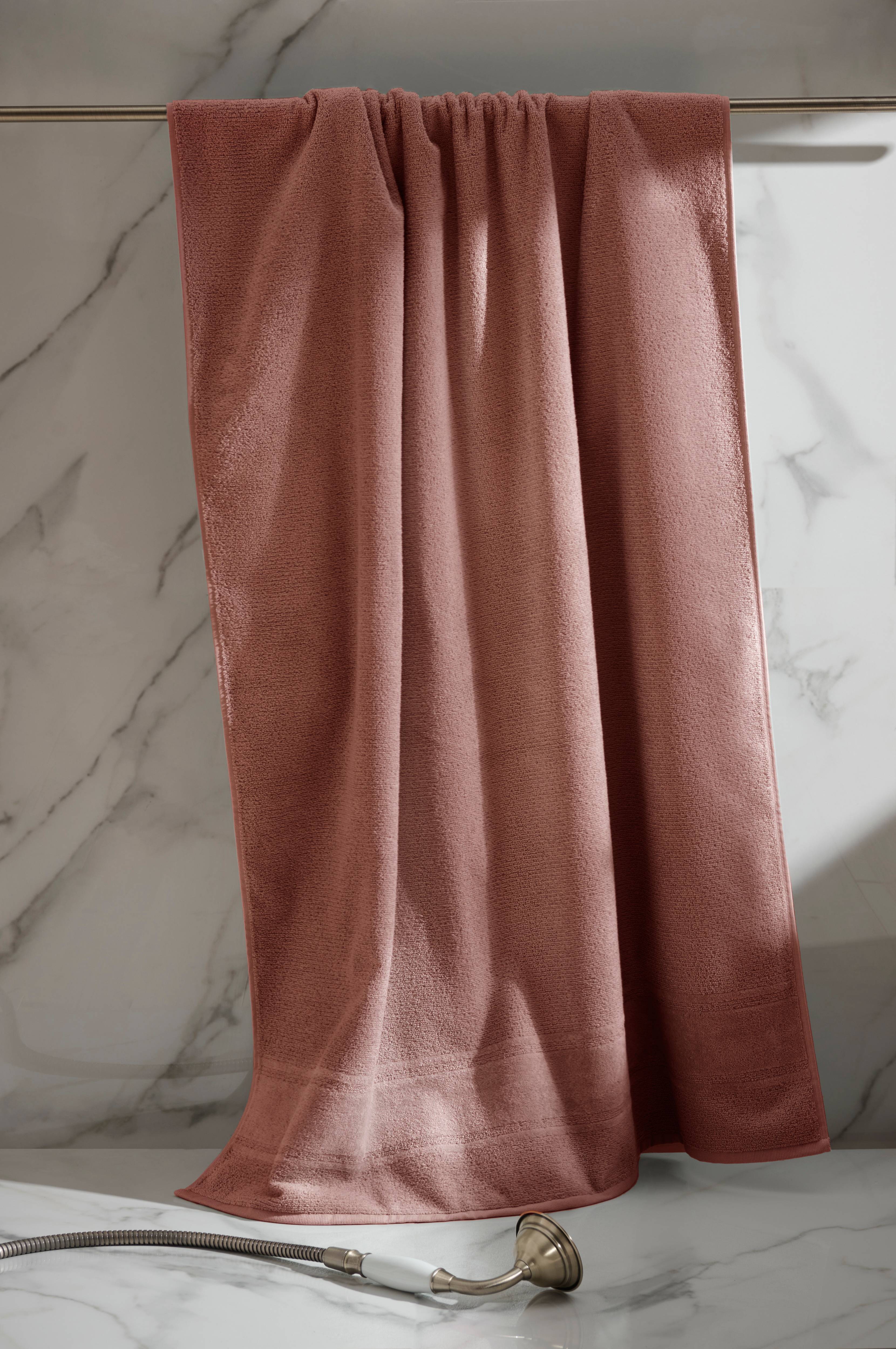 Håndklæde af blød bomuldsfrotté med let struktur og stribe i velour forneden. Str. 90 x 180 cm. Vægt 520 g/m2. Fremstillet i Portugal.