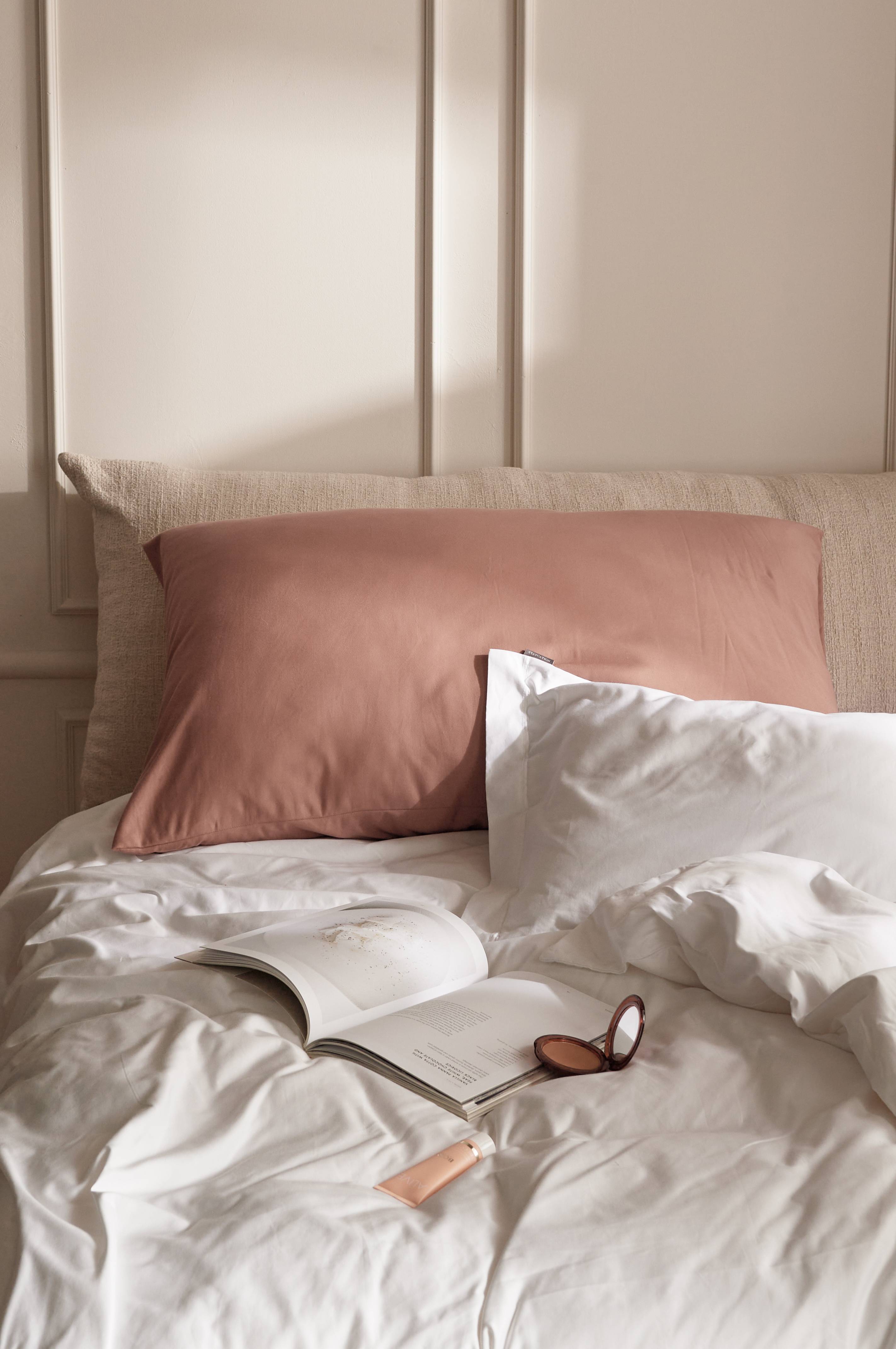 Stort hotelpudebetræk i kraftig, tætvævet satin af kæmmet, økologisk bomuld. Trådtæthed 800 tc. Mellemhøj pude med fyld af silikoniseret hulfiber og betræk af økologisk bomuldspercale med trådtæthed 200 TC.