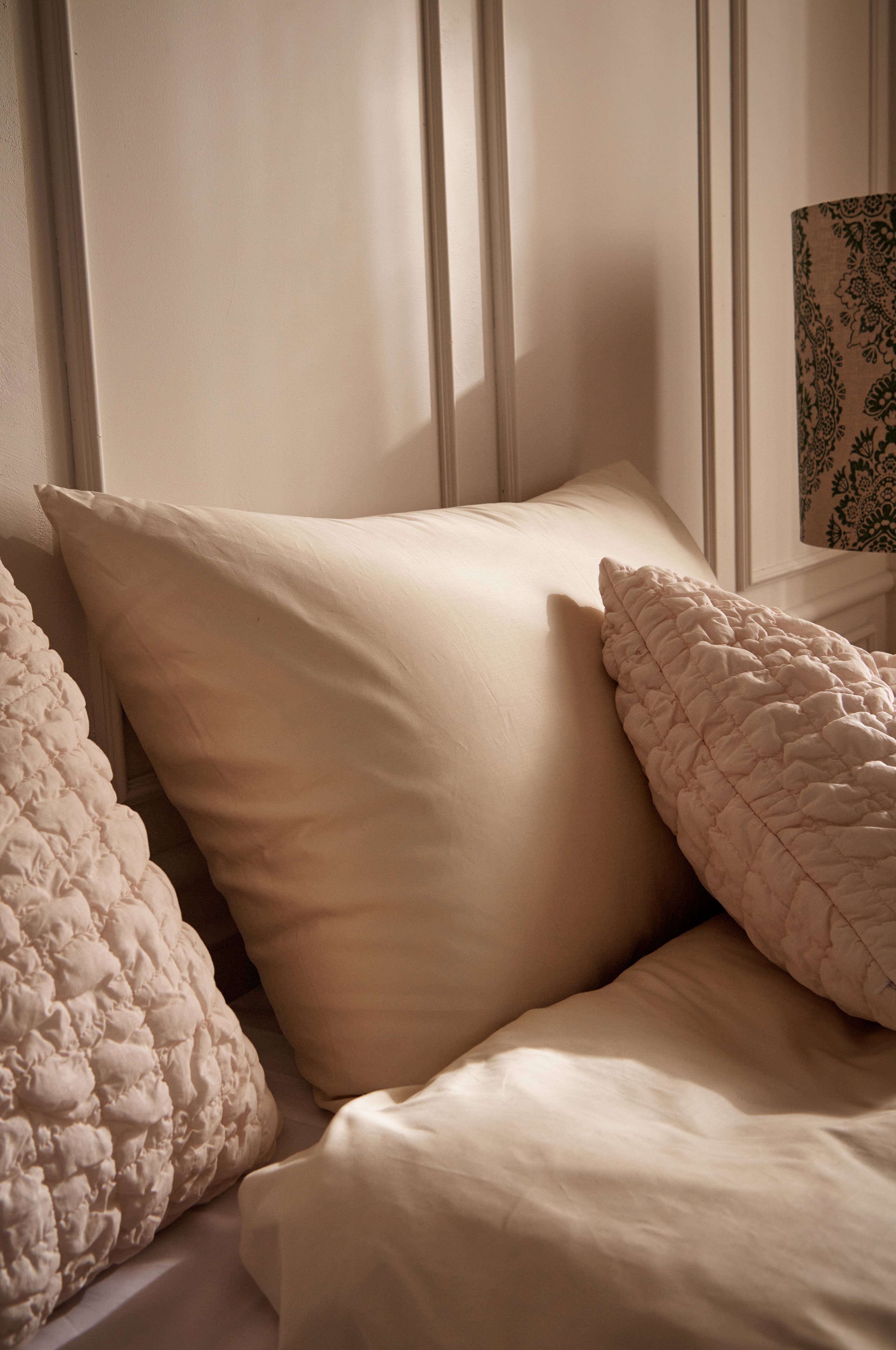 Stort hotelpudebetræk i kraftig, tætvævet satin af kæmmet, økologisk bomuld. Trådtæthed 800 tc. Mellemhøj pude med fyld af silikoniseret hulfiber og betræk af økologisk bomuldspercale med trådtæthed 200 TC.